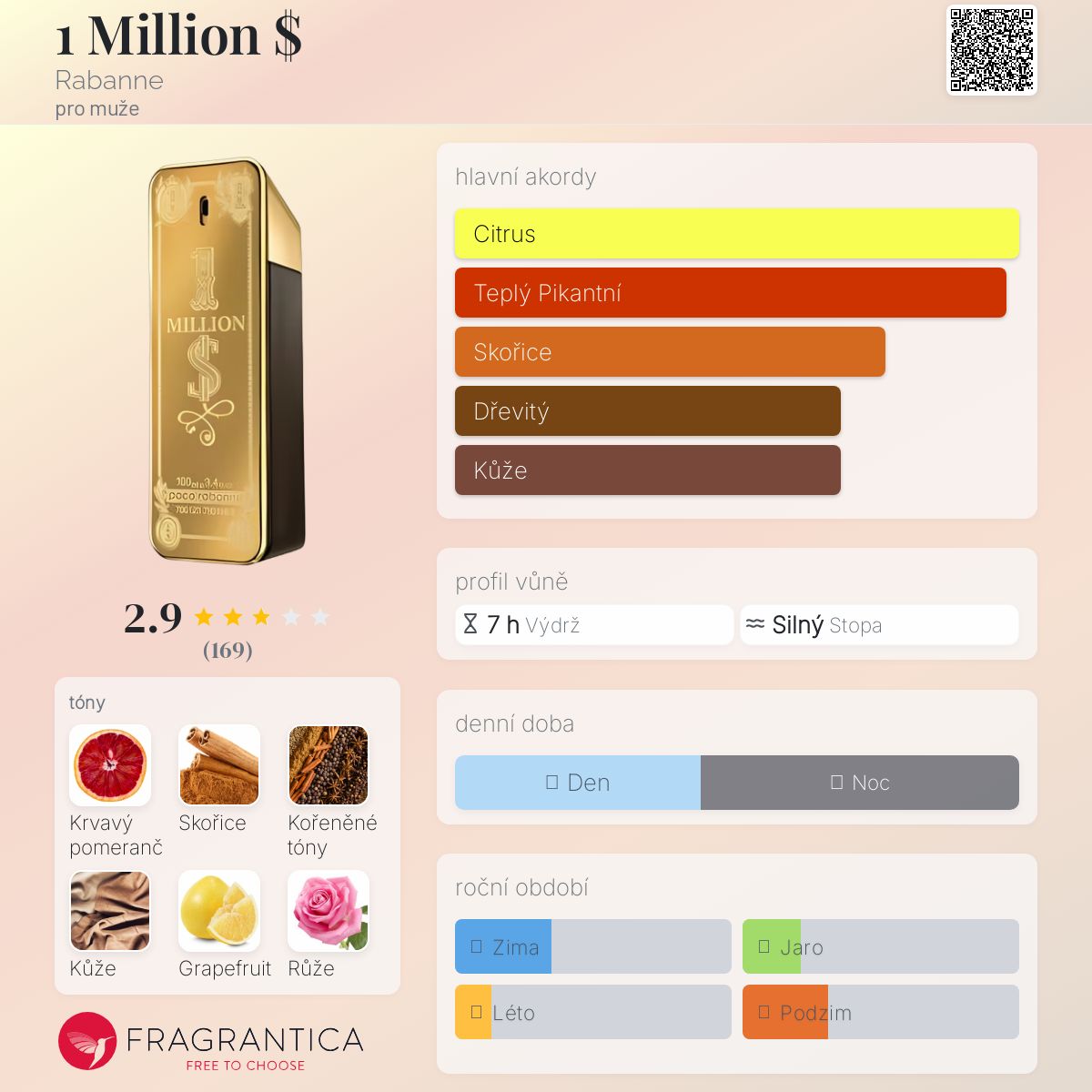 1 Million $ podle Rabanne je Woody Spicy vůně pro muže. 1 Million $ byl/a uveden/a v roce 2014. 1 Million $ byl/a vytvořen/a Christophe Raynaud, Olivier Pescheux a Michel Girard. Vrchní tóny jsou Krvavý pomeranč, Grapefruit a Máta; střední tóny jsouSkořice, Koření a Růže ; základní tóny jsou Kůže, Pačuli, Bílé dřevo a Jantar (ambra).