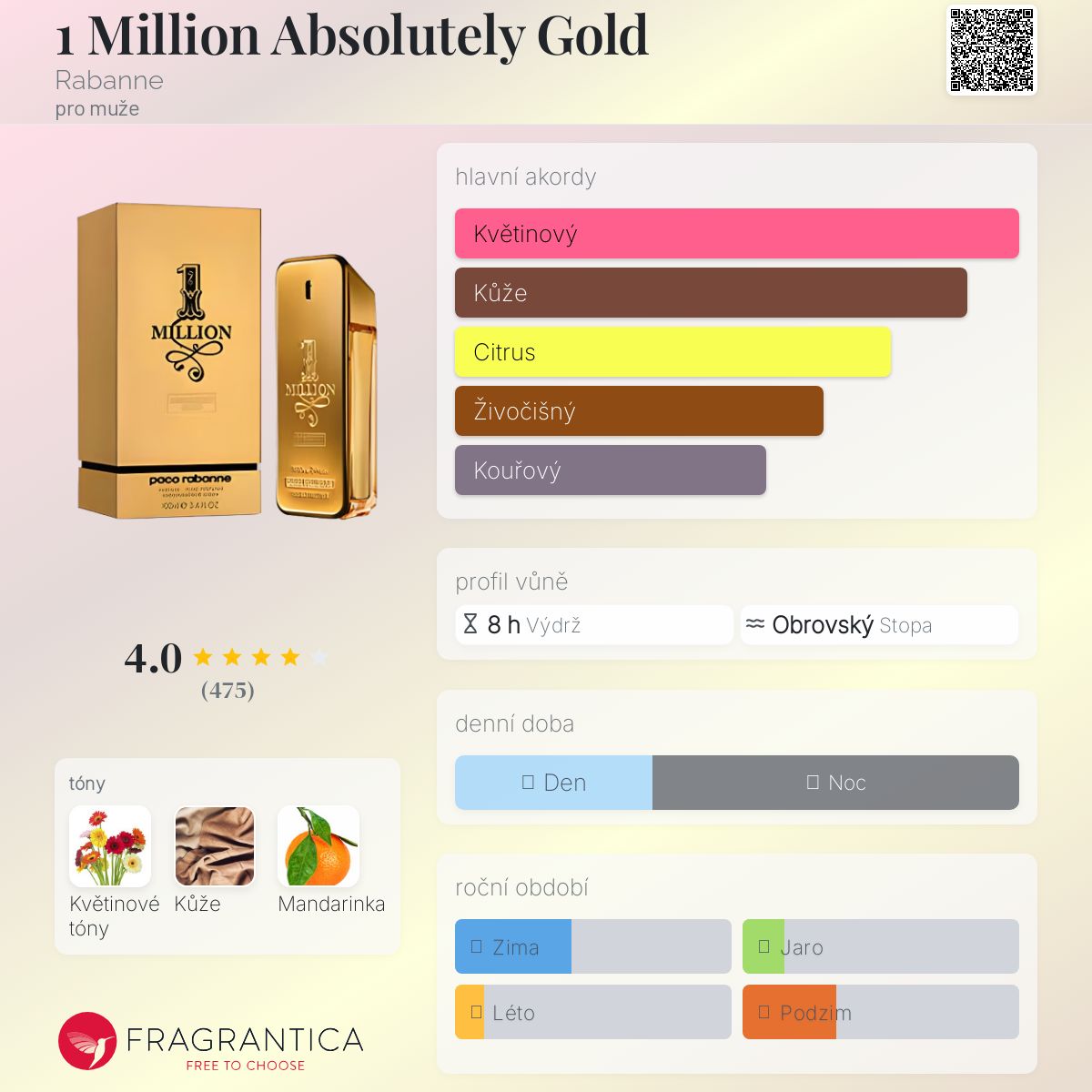 1 Million Absolutely Gold podle Rabanne je Leather vůně pro muže. 1 Million Absolutely Gold byl/a uveden/a v roce 2012. Vrchní tón je Mandarinka ; střední tón jeKvětiny ; základní tón je Kůže.