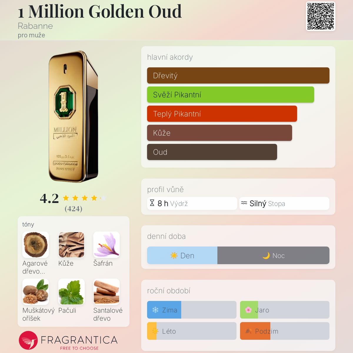 1 Million Golden Oud podle Rabanne je Leather vůně pro muže. 1 Million Golden Oud byl/a uveden/a v roce 2023. "Nosem" za touto vůní je Christophe Raynaud. Vrchní tóny jsou Šafrán, Muškátový oříšek, Černý pepř a Bergamot; střední tóny jsouPačuli, Santalové dřevo a Gurjanský balzám ; základní tóny jsou Agarové dřevo (oud), Kůže, Cedr a Labdanum.