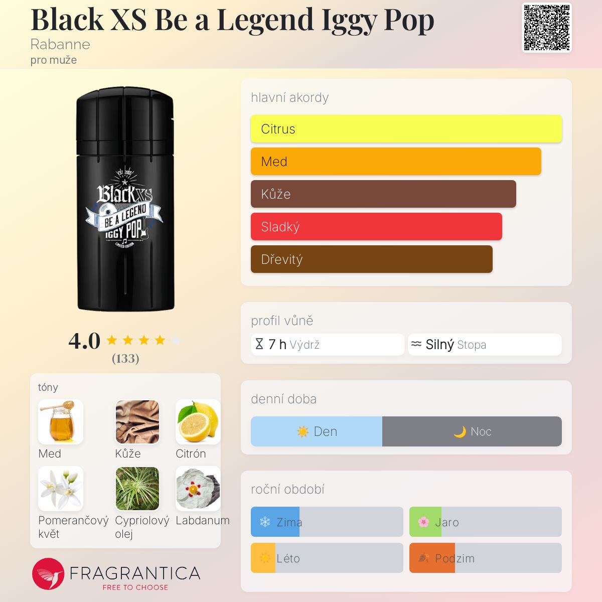 Black XS Be a Legend Iggy Pop podle Rabanne je Orientální Woody vůně pro muže. Black XS Be a Legend Iggy Pop byl/a uveden/a v roce 2014. Black XS Be a Legend Iggy Pop byl/a vytvořen/a Fabrice Pellegrin a Olivier Cresp. Vrchní tóny jsou Citrón a Skořice; střední tóny jsouMed a Pomerančový květ ; základní tóny jsou Kůže, Cypriolový olej a Labdanum.