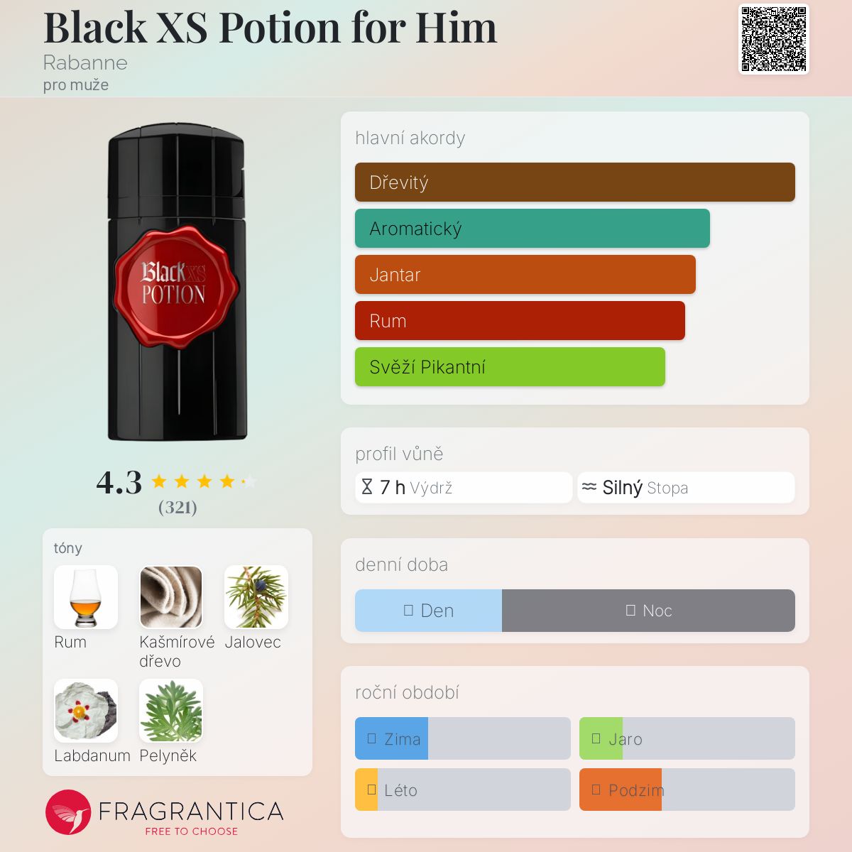 Black XS Potion for Him podle Rabanne je Woody Spicy vůně pro muže. Black XS Potion for Him byl/a uveden/a v roce 2014. Black XS Potion for Him byl/a vytvořen/a Olivier Cresp a Emilie Coppermann. Vrchní tón je Jalovec ; střední tóny jsouKašmírové dřevo a Pelyněk ; základní tóny jsou Rum a Labdanum.