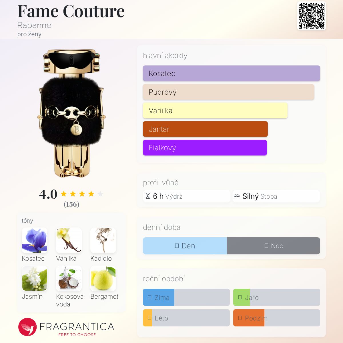 Fame Couture podle Rabanne je Orientální Floral vůně pro ženy. Toto je nová vůně. Fame Couture byl/a uveden/a v roce 2024. Fame Couture byl/a vytvořen/a Dora Baghriche a Marie Salamagne. Vrchní tóny jsou Kadidlo, Kokosová voda a Bergamot; střední tóny jsouKosatec, Jasmín Sambac a Wolfwood ; základní tóny jsou Vanilka, Australské santalové dřevo a Pižmo.