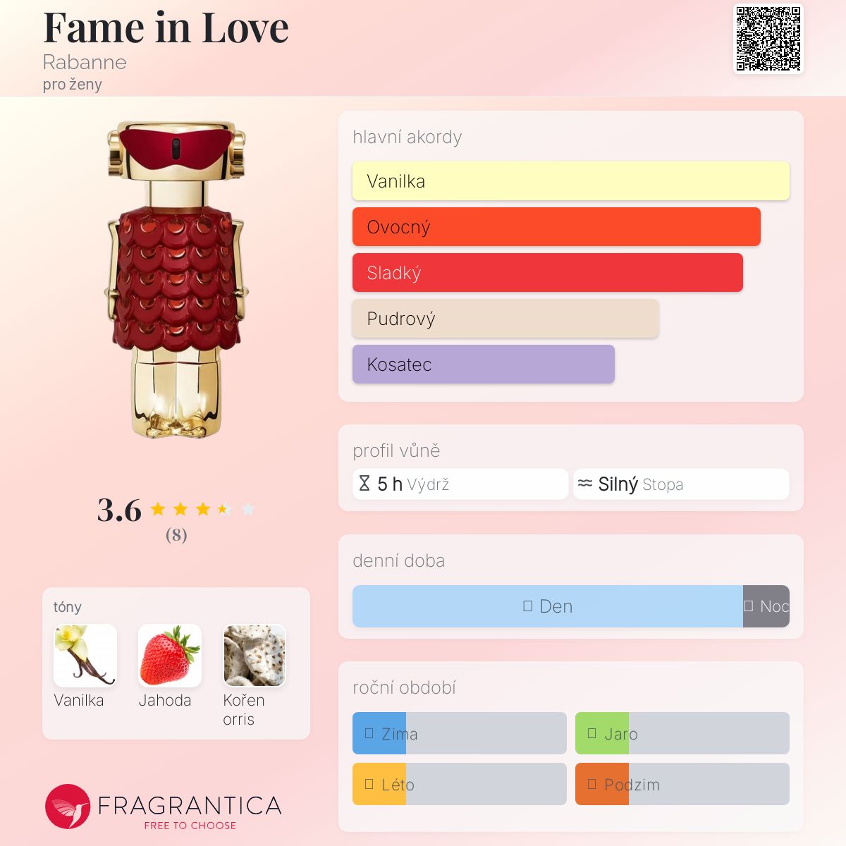 Fame in Love podle Rabanne je Floral Fruity Gourmand vůně pro ženy. Toto je nová vůně. Fame in Love byl/a uveden/a v roce 2025. Vrchní tón je Jahoda ; střední tón jeOrris ; základní tón je Vanilka.