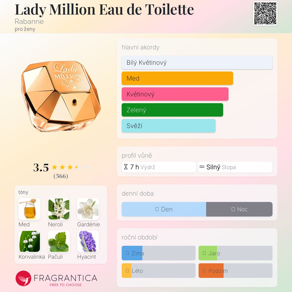 Lady Million Eau de Toilette podle Rabanne je Floral Woody Musk vůně pro ženy. Lady Million Eau de Toilette byl/a uveden/a v roce 2012. "Nosem" za touto vůní je Anne Flipo. Vrchní tóny jsou Neroli a Konvalinka; střední tóny jsouGardénie a Hyacint ; základní tóny jsou Med a Pačuli.
