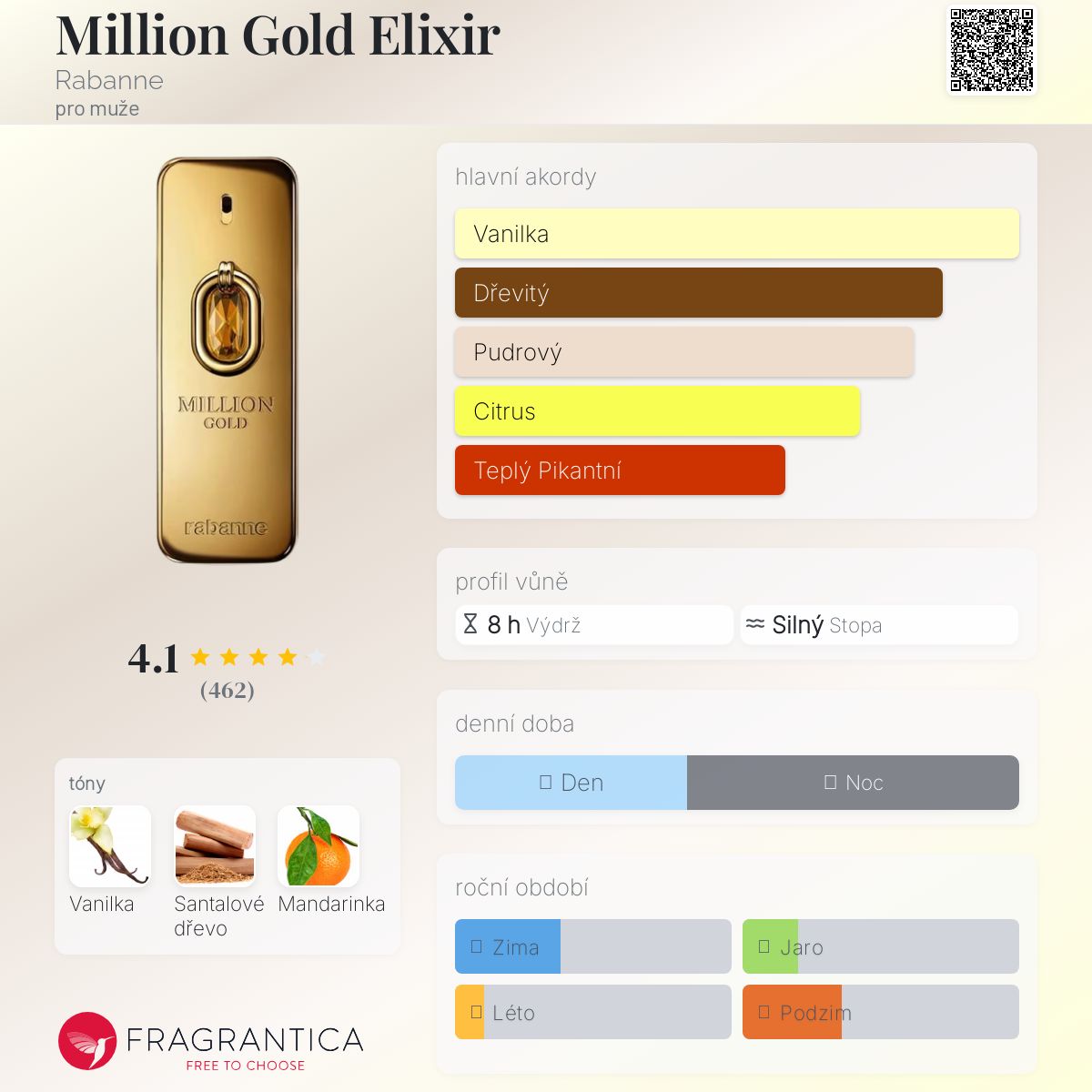 Million Gold Elixir podle Rabanne je Orientální Vanilla vůně pro muže. Toto je nová vůně. Million Gold Elixir byl/a uveden/a v roce 2025. Million Gold Elixir byl/a vytvořen/a Quentin Bisch a Christophe Raynaud. Vrchní tón je Žlutá mandarinka ; střední tón jeSantalové dřevo ; základní tón je Vanilka.