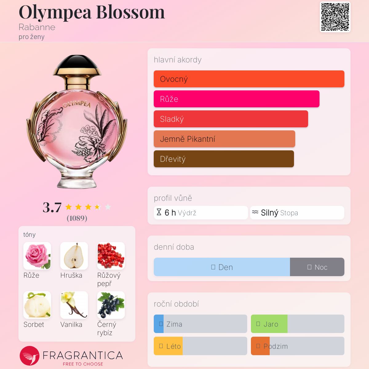 Olympea Blossom podle Rabanne je Chypre Fruity vůně pro ženy. Olympea Blossom byl/a uveden/a v roce 2021. Vrchní tóny jsou Damašská růže a Růžový pepř; střední tóny jsouHruška, Sorbet a Černý rybíz ; základní tóny jsou Vanilka, Sůl, Kašmír a Pačuli.