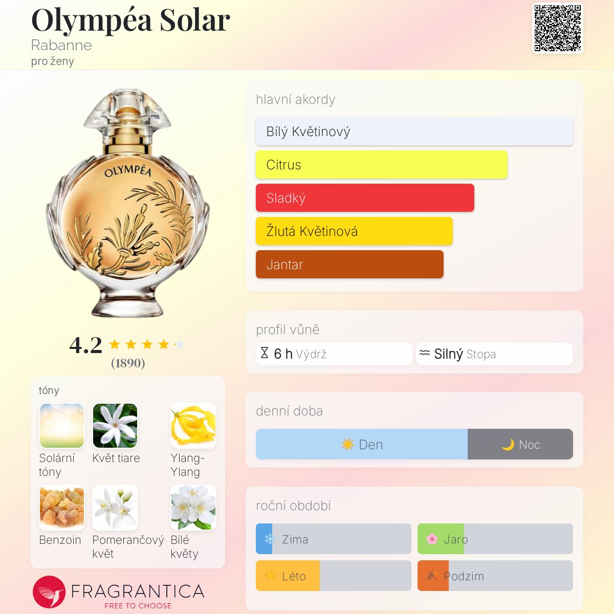 Zdá se mi, že hlavním vrcholem této vůně je velké množství trpkých citrusů na pozadí tiareskního a krémového základu. S takovým slunečním směrem nemám v parfumeriích moc zkušeností, ale podle mého názoru díky němu Olympia vyniká mezi svými kolegyněmi.
