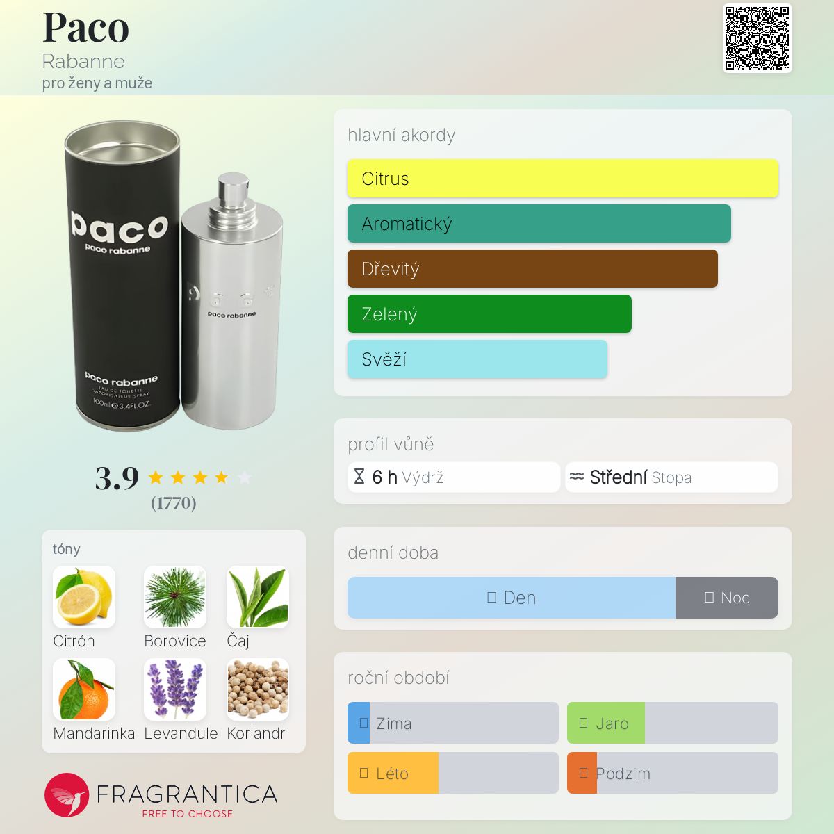 Paco podle Rabanne je Citrus Aromatic vůně pro ženy a muže. Paco byl/a uveden/a v roce 1995. "Nosem" za touto vůní je Rosendo Mateu. Vrchní tóny jsou Citron amalfi , Borovice, Mandarinka a Koriandr; střední tóny jsouČaj, Levandule, Jasmín a Brambořík ; základní tóny jsou Pižmo, Santalové dřevo, Virginský cedr a Fazole tonka.