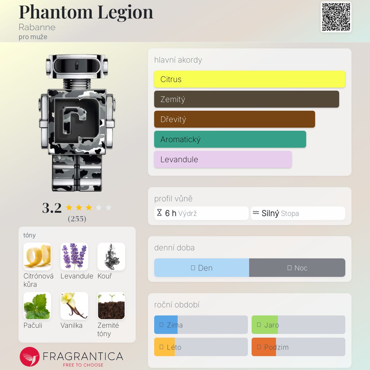 Phantom Legion podle Rabanne je vůně pro muže. Phantom Legion byl/a uveden/a v roce 2022. Phantom Legion byl/a vytvořen/a Anne Flipo, Dominique Ropion, Juliette Karagueuzoglou a Loc Dong. Vrchní tóny jsou Citrónová kůra, Levandule a Citrón; střední tóny jsouLevandule, Kouř, Pačuli, Zemité tóny a Jablko ; základní tóny jsou Levandule, Vanilka a Vetiver.