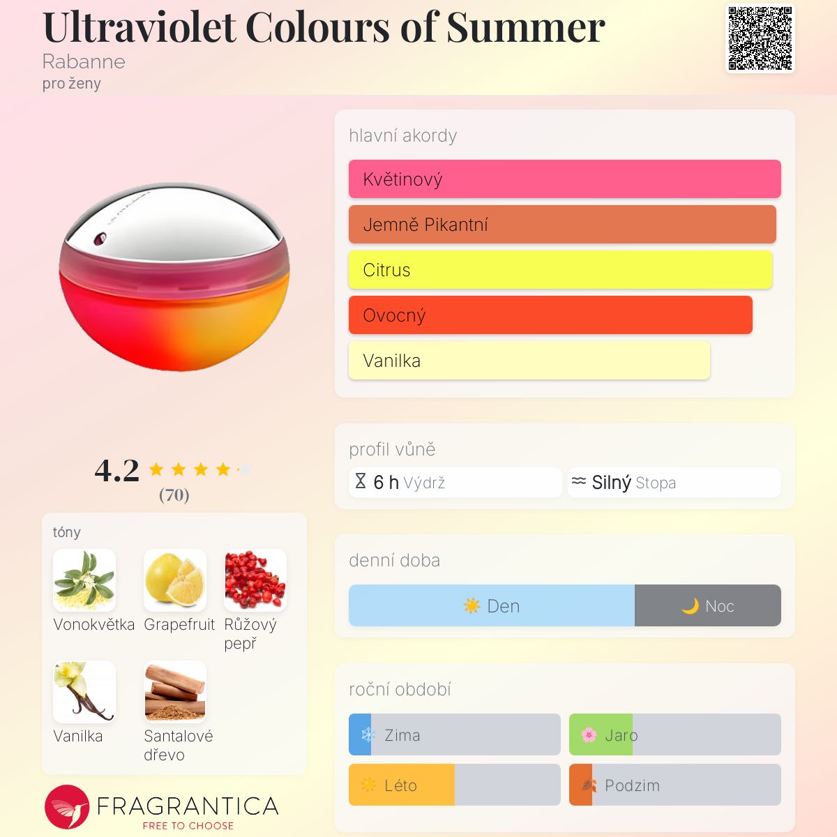 Ultraviolet Colours of Summer podle Rabanne je Floral Fruity vůně pro ženy. Ultraviolet Colours of Summer byl/a uveden/a v roce 2006. Vrchní tóny jsou Grapefruit a Růžový pepř; střední tón jeVonokvětka ; základní tóny jsou Vanilka a Santalové dřevo.