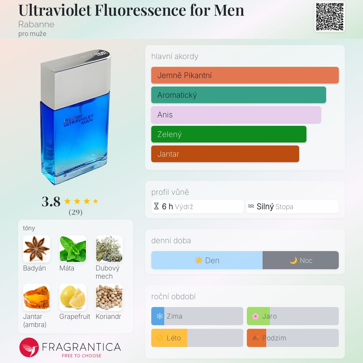 Ultraviolet Fluoressence for Men podle Rabanne je Woody Aromatic vůně pro muže. Ultraviolet Fluoressence for Men byl/a uveden/a v roce 2005. Vrchní tóny jsou Badyán a Máta; střední tóny jsouGrapefruit a Koriandr ; základní tóny jsou Dubový mech a Jantar (ambra).