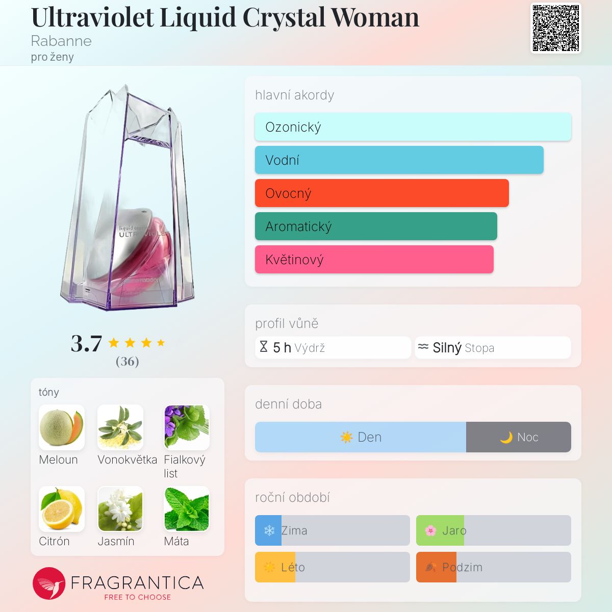 Ultraviolet Liquid Crystal Woman podle Rabanne je Orientální vůně pro ženy. Ultraviolet Liquid Crystal Woman byl/a uveden/a v roce 2003. Vrchní tóny jsou Meloun, Fialkový list a Citrón; střední tóny jsouVonokvětka, Jasmín a Máta ; základní tóny jsou Vetiver a Mech.