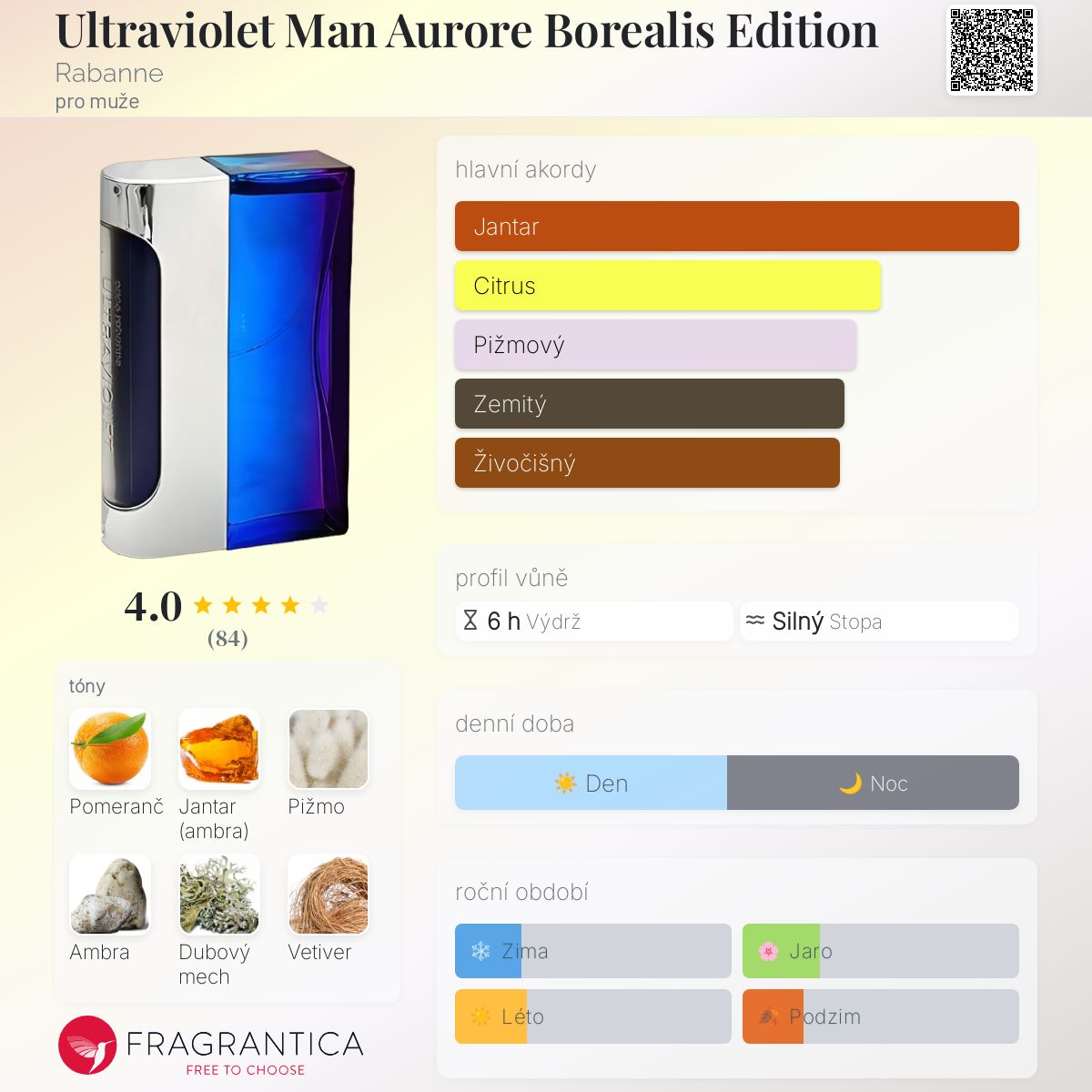 Ultraviolet Man Aurore Borealis Edition podle Rabanne je Woody Aromatic vůně pro muže. Ultraviolet Man Aurore Borealis Edition byl/a uveden/a v roce 2004. střední tóny jsouPomeranč a Vetiver ; základní tóny jsou Jantar (ambra), Pižmo, Ambra a Dubový mech.