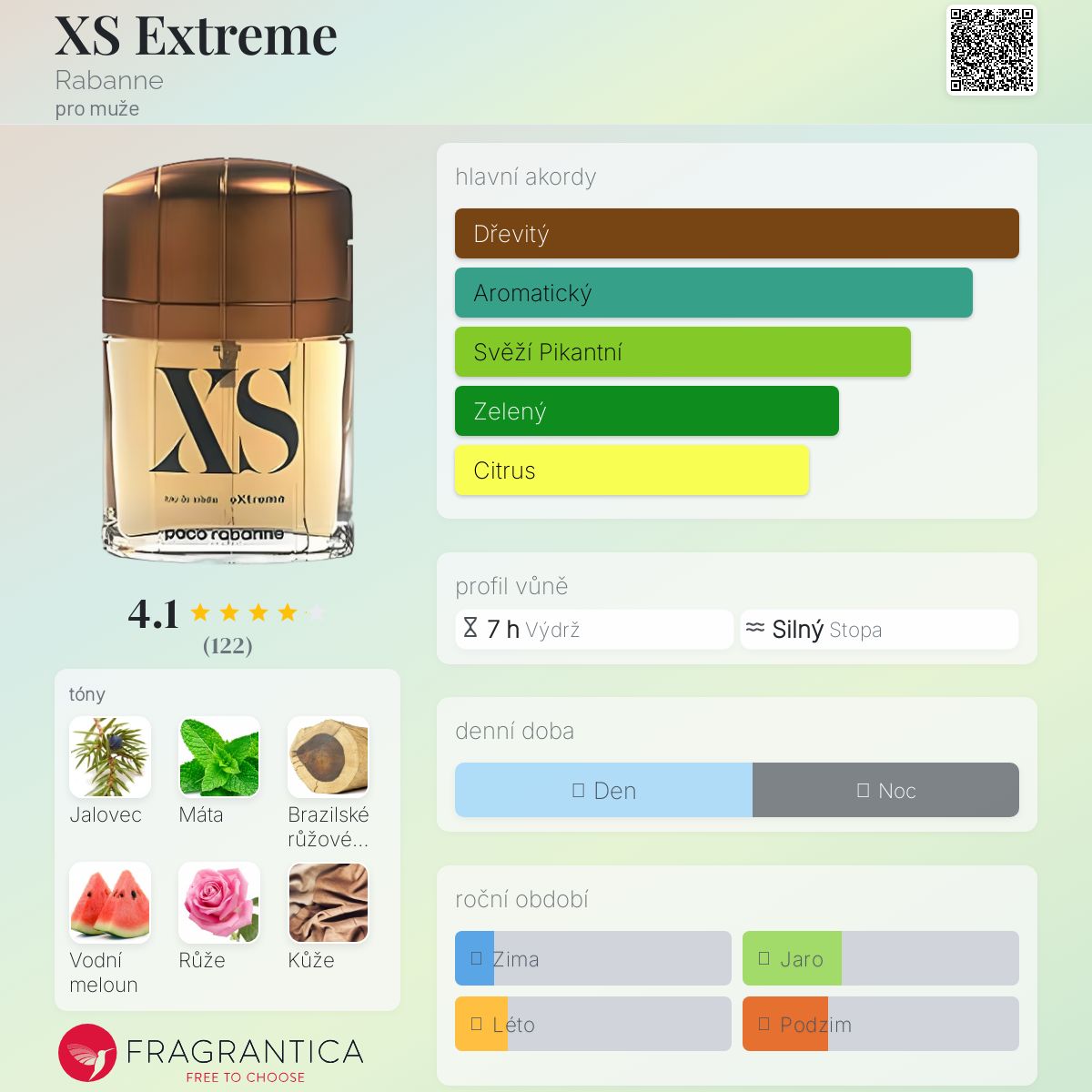 XS Extreme podle Rabanne je Woody Chypre vůně pro muže. XS Extreme byl/a uveden/a v roce 2000. XS Extreme byl/a vytvořen/a Rosendo Mateu a Gerard Anthony. Vrchní tóny jsou Máta, Petitgrain a Bergamot; střední tóny jsouJalovec, Brazilské růžové dřevo, Vodní meloun a Růže ; základní tóny jsou Kůže, Dubový mech, Cedr a Pižmo.