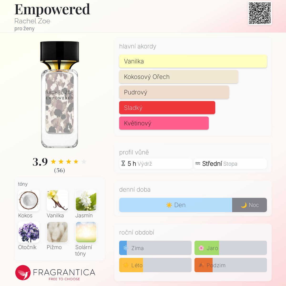 Empowered podle Rachel Zoe je Orientální Vanilla vůně pro ženy. Empowered byl/a uveden/a v roce 2021. Vrchní tóny jsou Jasmín, Solární tóny a Květiny; střední tóny jsouKokos a Otočník ; základní tóny jsou Vanilka, Pižmo a Bílé dřevo.
