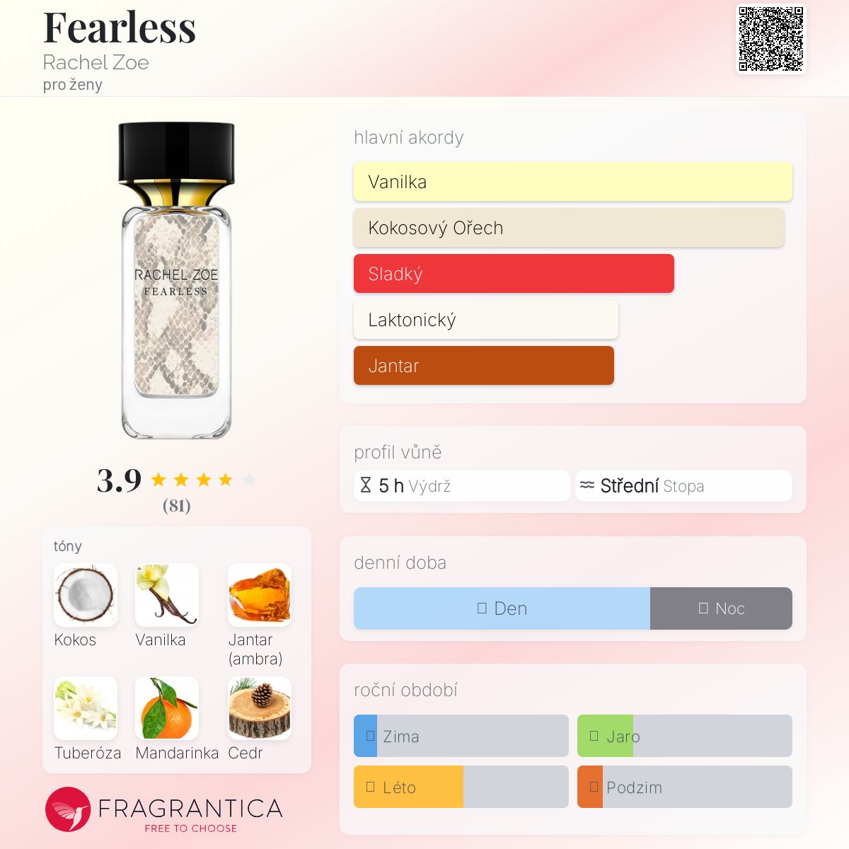 Fearless podle Rachel Zoe je Orientální Vanilla vůně pro ženy. Fearless byl/a uveden/a v roce 2021. Vrchní tóny jsou Mandarinka, Sporýš a Černý rybíz; střední tóny jsouKokos a Tuberóza ; základní tóny jsou Vanilka, Jantar (ambra) a Cedr.