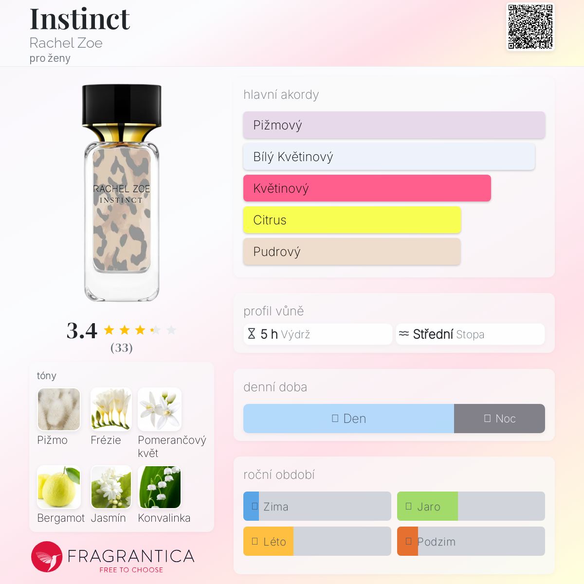 Instinct podle Rachel Zoe je Woody Floral Musk vůně pro ženy. Instinct byl/a uveden/a v roce 2021. Vrchní tóny jsou Pomerančový květ a Bergamot; střední tóny jsouFrézie, Jasmín a Konvalinka ; základní tón je Pižmo.