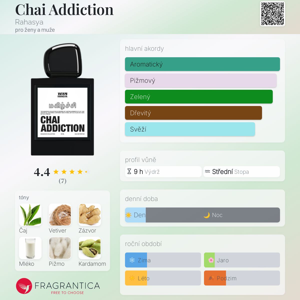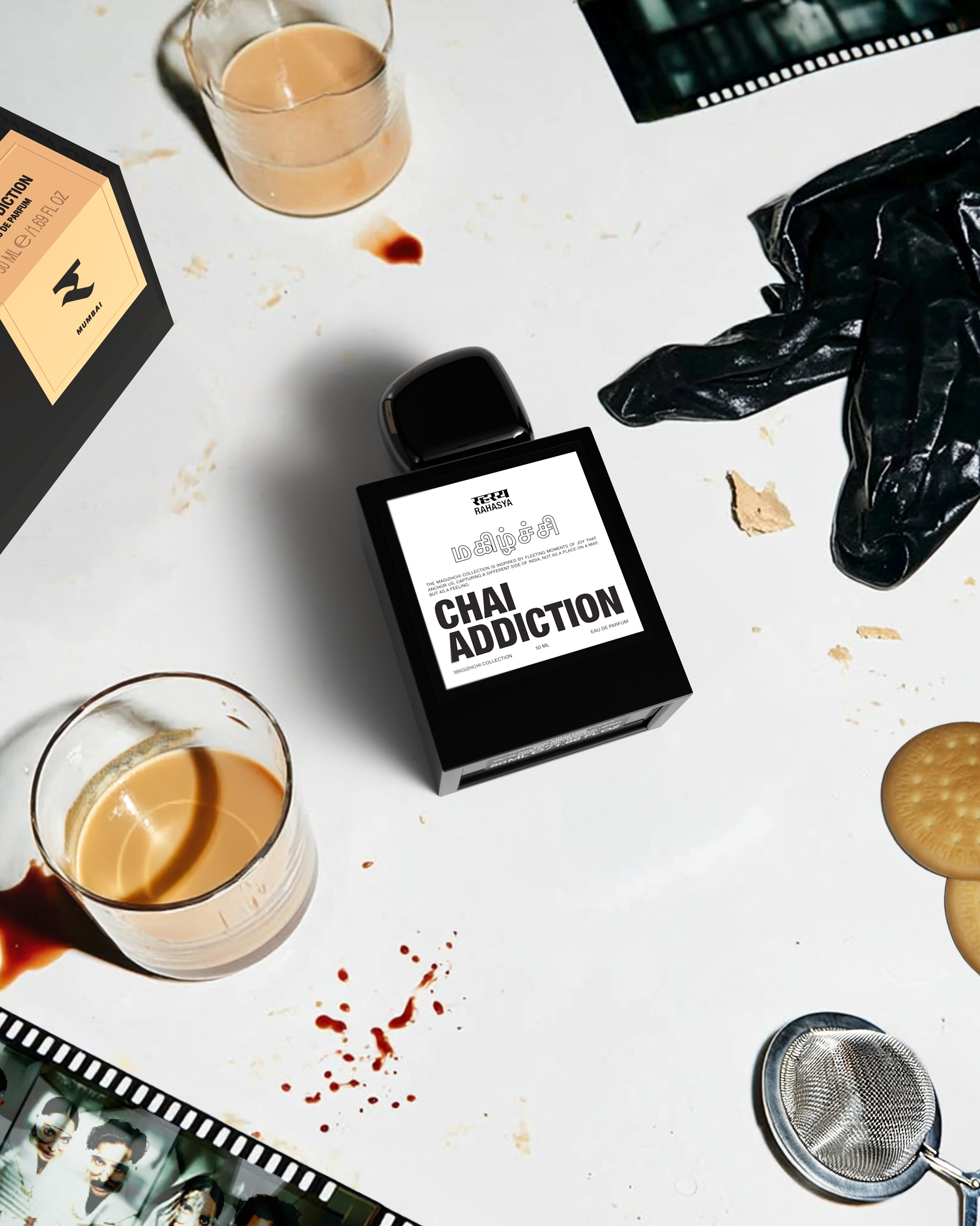 Chai Addiction podle Rahasya je Woody Spicy vůně pro ženy a muže. Toto je nová vůně. Chai Addiction byl/a uveden/a v roce 2025. "Nosem" za touto vůní je Kajal Gujar. Vrchní tóny jsou Černý čaj, Zázvor a Kardamom; střední tóny jsouVetiver, Mléko, Magnólie a Vanilka ; základní tóny jsou Bílé pižmo, Santalové dřevo Mysore a Semiš.