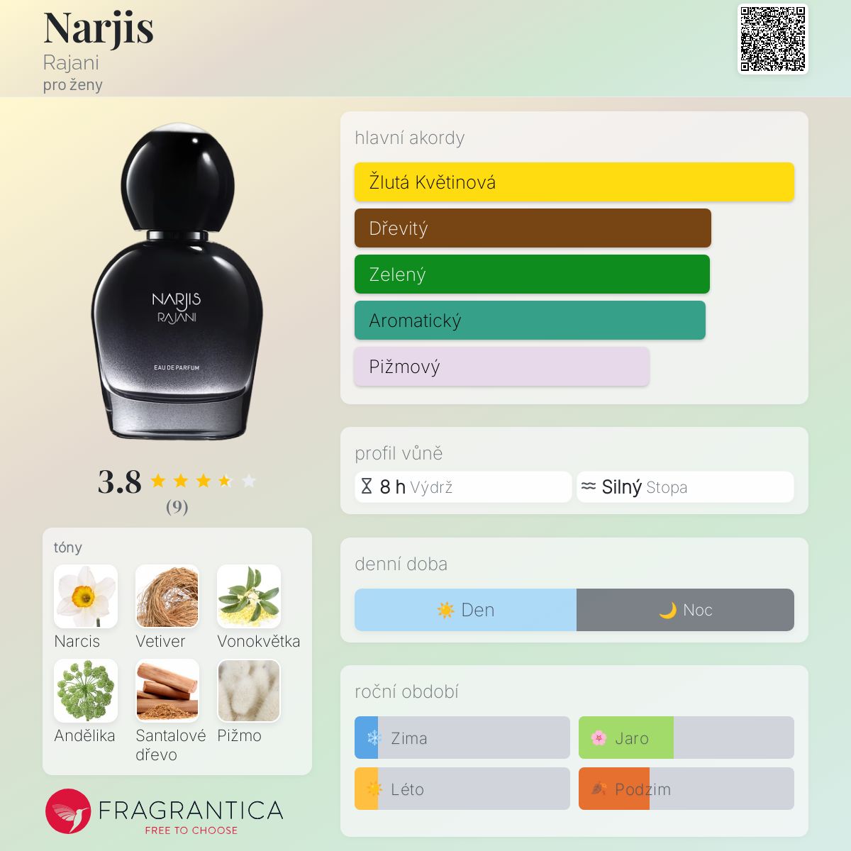 Narjis podle Rajani je vůně pro ženy. Narjis byl/a uveden/a v roce 2018. "Nosem" za touto vůní je Raffaella Tarana. Vrchní tóny jsou Andělika a Sladký pomeranč; střední tóny jsouNarcis, Vonokvětka a Ylang-Ylang ; základní tóny jsou Vetiver, Santalové dřevo, Pižmo a Kosatec.