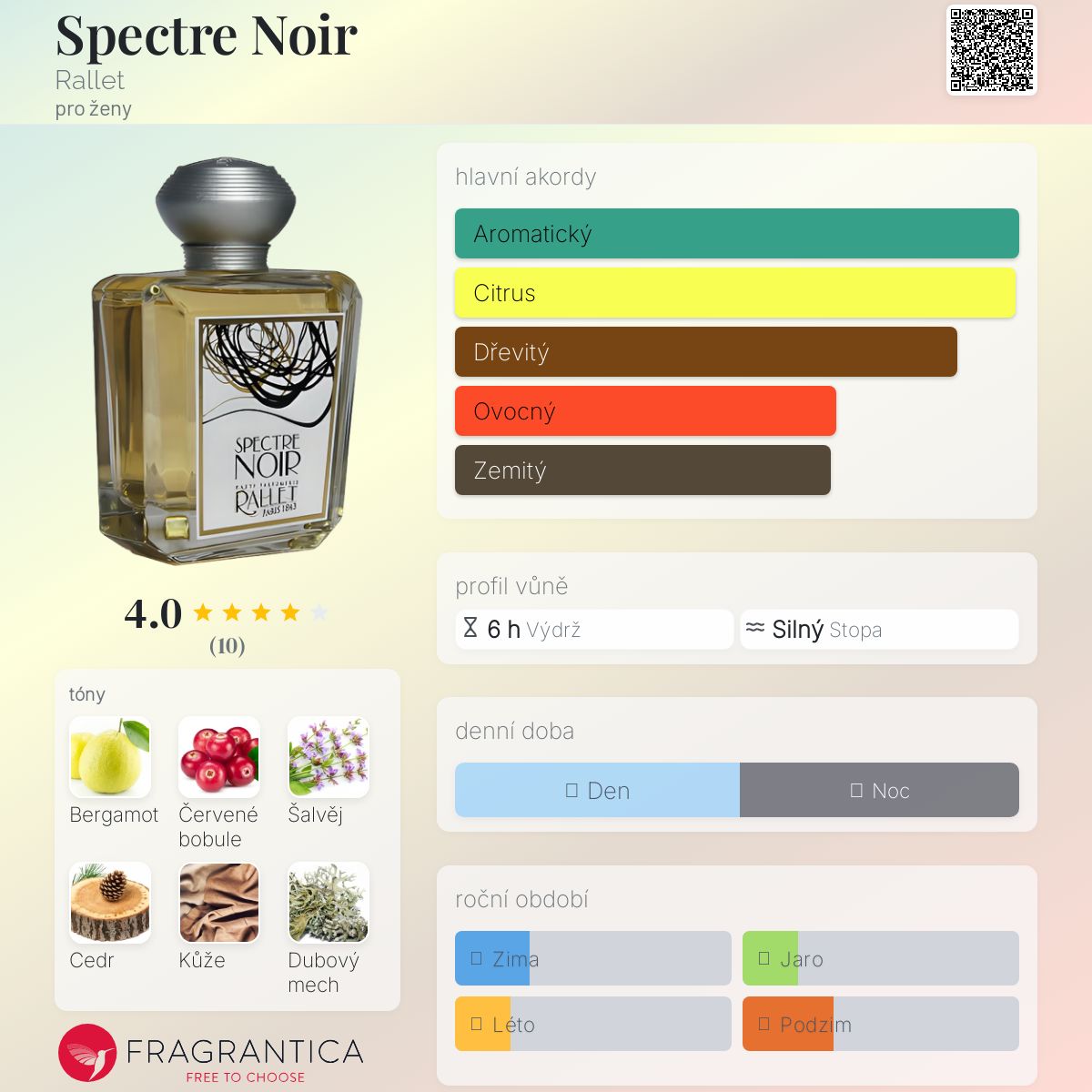 Spectre Noir podle Rallet je Leather vůně pro ženy. Spectre Noir byl/a uveden/a v roce 2013. "Nosem" za touto vůní je Benoist Lapouza. Vrchní tóny jsou Bergamot, Červené bobule, Mandarinka, Citrón a Grapefruit; střední tóny jsouŠalvěj, Estragon, Pryskyřice elimi a Hřebíček ; základní tóny jsou Cedr, Kůže, Dubový mech, Pačuli, Benzoin a Vetiver.