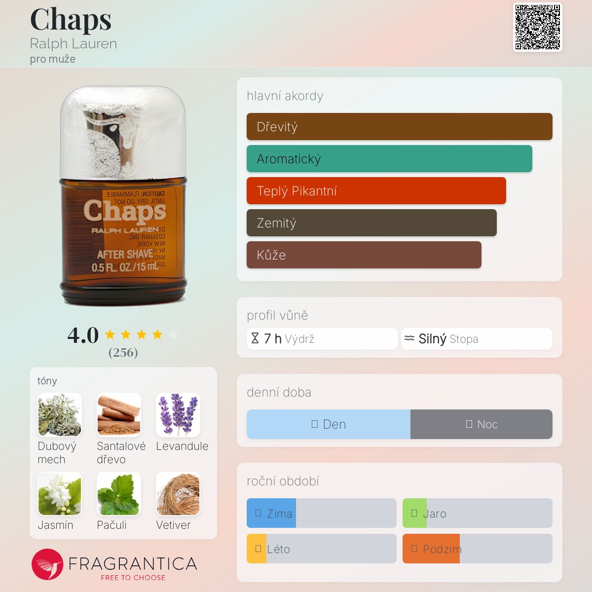 Chaps podle Ralph Lauren je Woody Chypre vůně pro muže. Chaps byl/a uveden/a v roce 1979. "Nosem" za touto vůní je Josephine Catapano. Vrchní tóny jsou Levandule, Limetka, Bergamot, Citrón, Šalvěj muškátová a Anýz; střední tóny jsouSantalové dřevo, Jasmín, Pačuli, Vetiver, Kořen orris, Karafiát, Cedr a Pelargónie ; základní tóny jsou Mech, Jantar (ambra), Vanilka, Pižmo, Benzoin, Med a Fazole tonka.