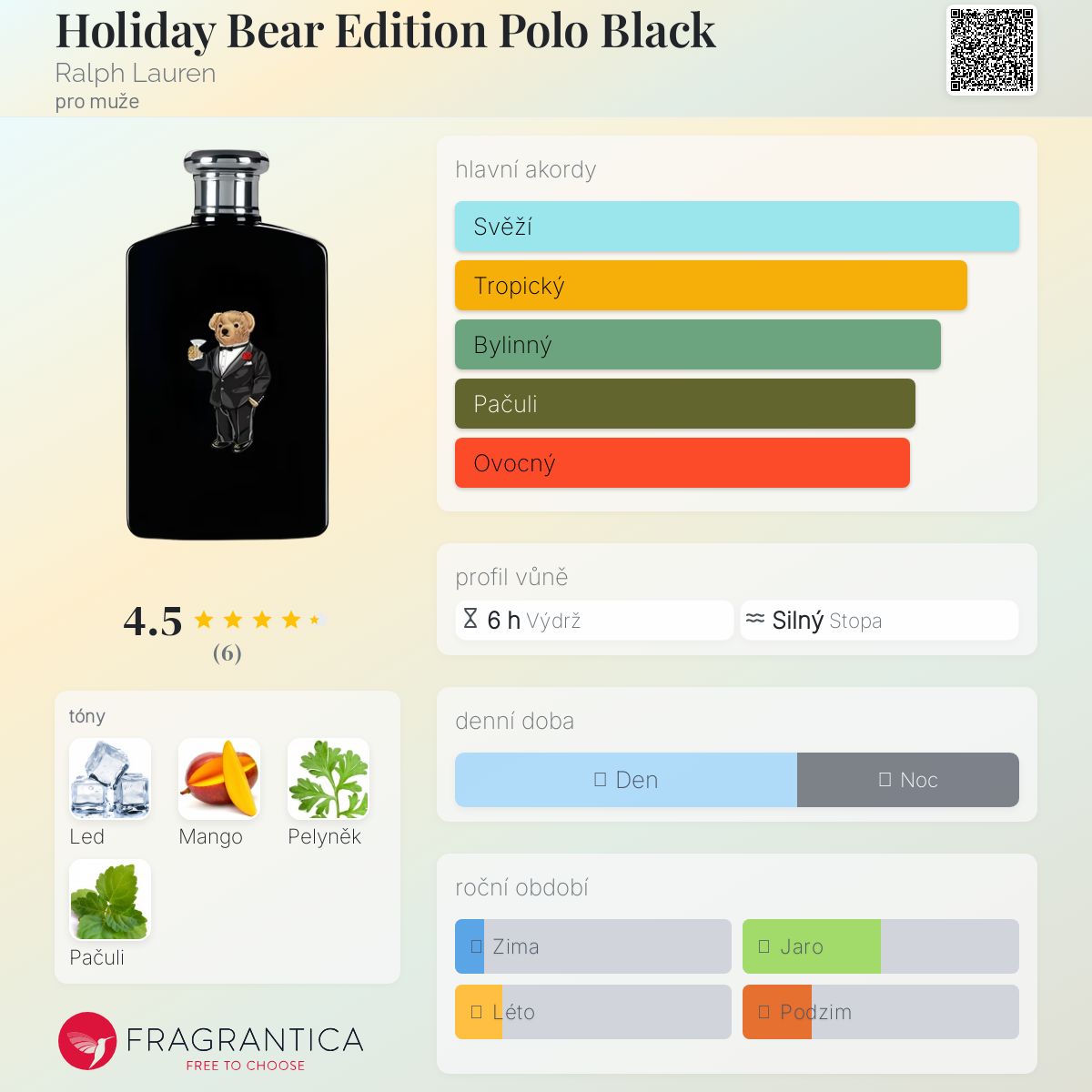 Holiday Bear Edition Polo Black podle Ralph Lauren je Woody Aromatic vůně pro muže. Holiday Bear Edition Polo Black byl/a uveden/a v roce 2019. Vrchní tóny jsou Led a Mango; střední tón jePelyněk ; základní tón je Pačuli.