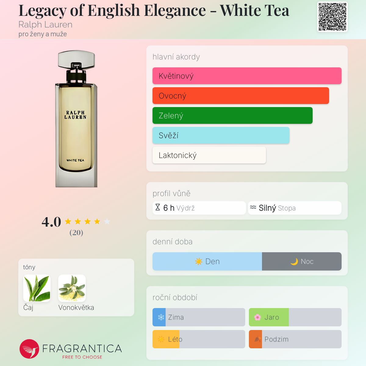 Legacy of English Elegance - White Tea podle Ralph Lauren je Aromatic vůně pro ženy a muže. Legacy of English Elegance - White Tea byl/a uveden/a v roce 2016. "Nosem" za touto vůní je Carlos Benaïm.