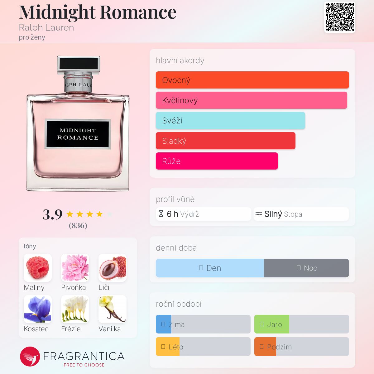 Midnight Romance podle Ralph Lauren je Orientální Floral vůně pro ženy. Midnight Romance byl/a uveden/a v roce 2014. Midnight Romance byl/a vytvořen/a Honorine Blanc a Alberto Morillas. Vrchní tóny jsou Maliny, Liči a Bergamot; střední tóny jsouPivoňka, Frézie a Jasmín Sambac ; základní tóny jsou Kosatec, Vanilka a Ambroxan.