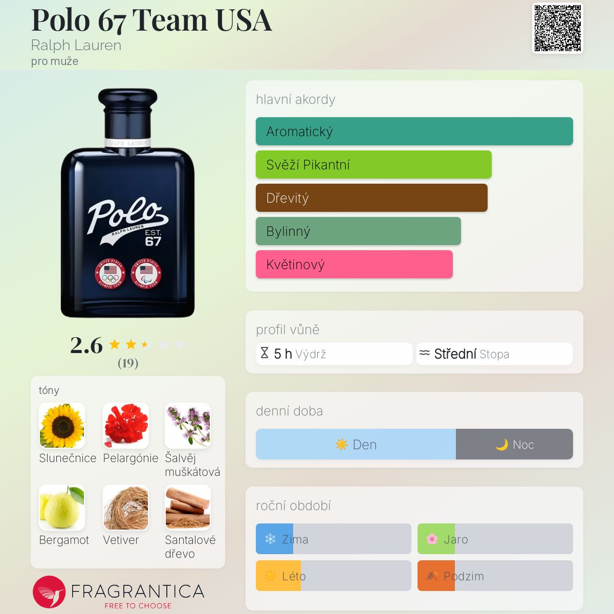 Polo 67 Team USA podle Ralph Lauren je Aromatic Aquatic vůně pro muže. Toto je nová vůně. Polo 67 Team USA byl/a uveden/a v roce 2025. Vrchní tón je Bergamot ; střední tóny jsouSlunečnice, Pelargónie a Šalvěj muškátová ; základní tóny jsou Haitský vetiver, Santalové dřevo a Pačuli.