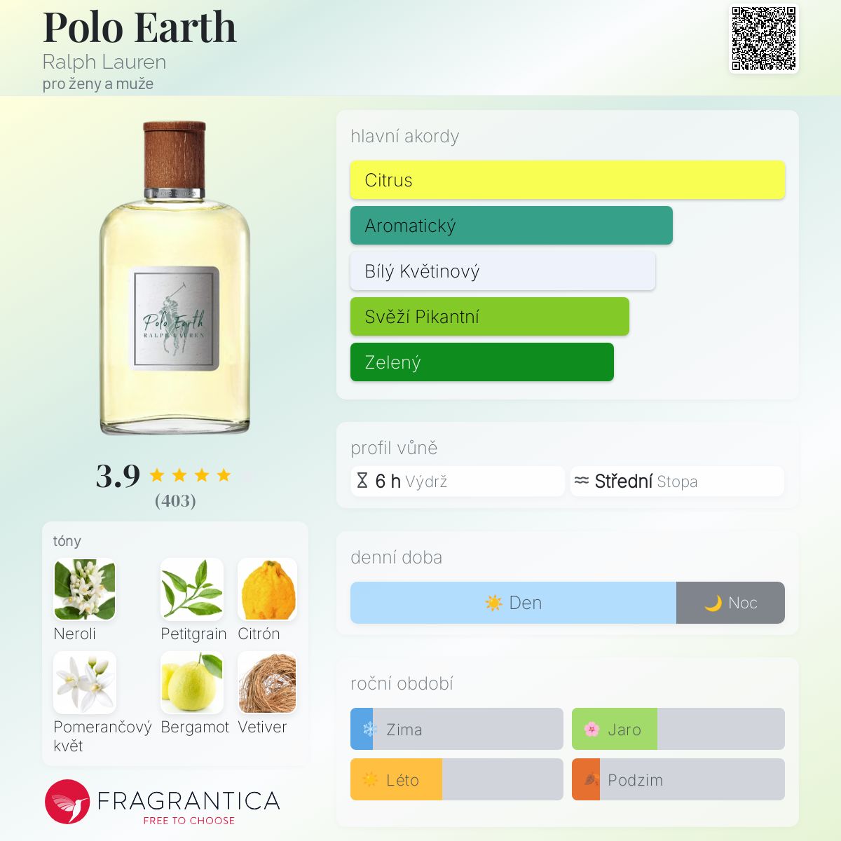 Polo Earth podle Ralph Lauren je Aromatic vůně pro ženy a muže. Polo Earth byl/a uveden/a v roce 2022. Vrchní tóny jsou Neroli, Petitgrain, Citrón, Bergamot, Pikantní máta a Zelená mandarinka; střední tóny jsouPomerančový květ, Pelargónie, Ylang-Ylang, Levandule, Šalvěj a Růže ; základní tóny jsou Haitský vetiver, Pižmo a Cedr.
