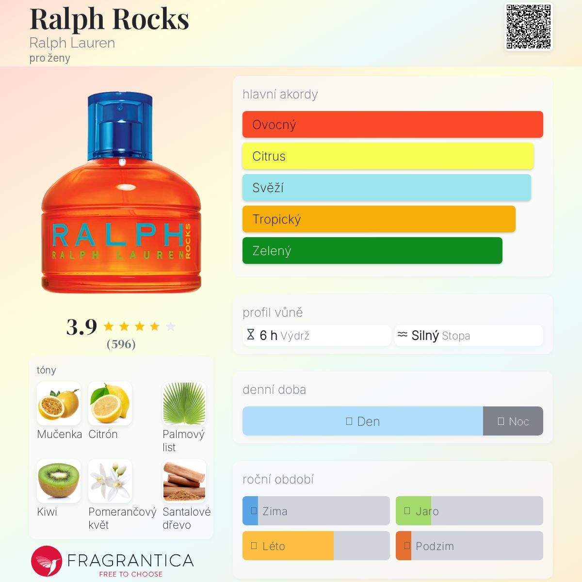 Ralph Rocks podle Ralph Lauren je Floral Fruity vůně pro ženy. Ralph Rocks byl/a uveden/a v roce 2006. "Nosem" za touto vůní je Annie Buzantian. Vrchní tóny jsou Mučenka, Citrón a Kiwi; střední tóny jsouPalmový list, Pomerančový květ, Hyacint a Frézie ; základní tóny jsou Santalové dřevo a Jantar (ambra).