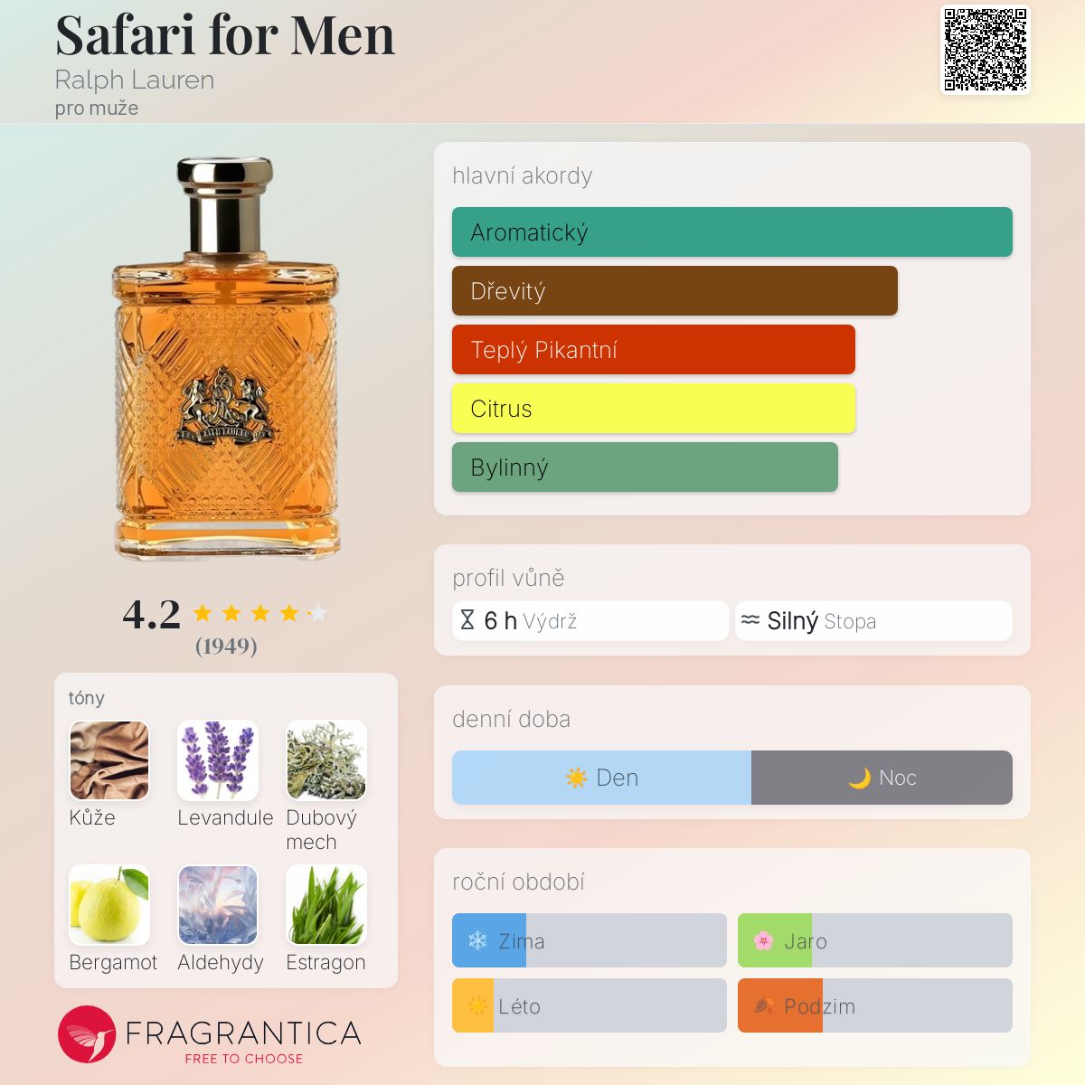 Safari for Men podle Ralph Lauren je Woody Aromatic vůně pro muže. Safari for Men byl/a uveden/a v roce 1992. Vrchní tóny jsou Levandule, Bergamot, Aldehydy, Koriandr, Zelené tóny, Pelyněk, Citrón a Neroli; střední tóny jsouEstragon, Karafiát, Skořice, Růže, Brambořík a Jasmín ; základní tóny jsou Kůže, Dubový mech, Santalové dřevo, Pižmo, Cedr, Pačuli a Jantar (ambra).