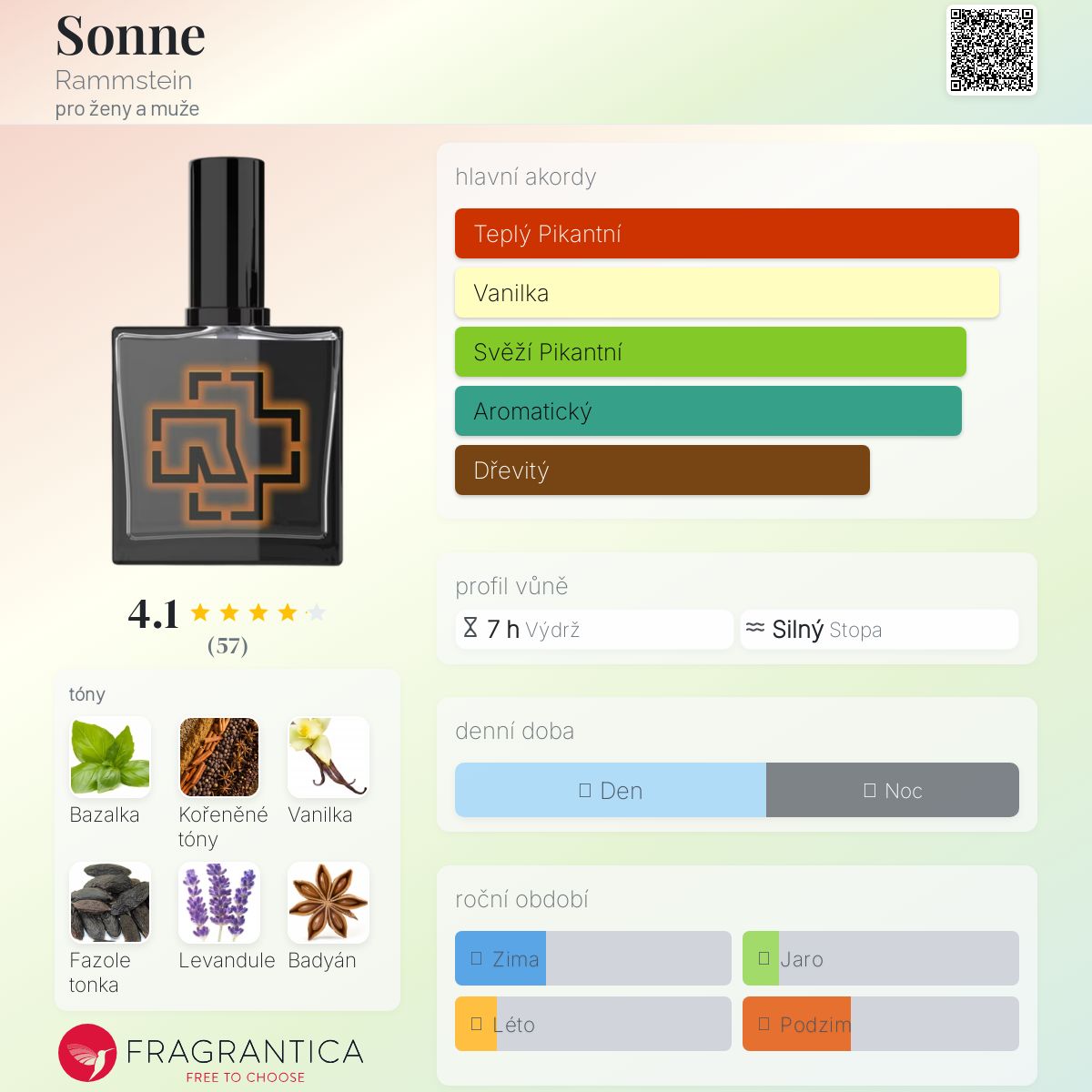 Sonne podle Rammstein je Woody Spicy vůně pro ženy a muže. Toto je nová vůně. Sonne byl/a uveden/a v roce 2024. Vrchní tóny jsou Bazalka, Kořeněné tóny, Levandule a Badyán; střední tóny jsouHřebíček, Cedr, Santalové dřevo, Otočník a Káva ; základní tóny jsou Vanilka, Fazole tonka, Pačuli, Kůže a Dubový mech.