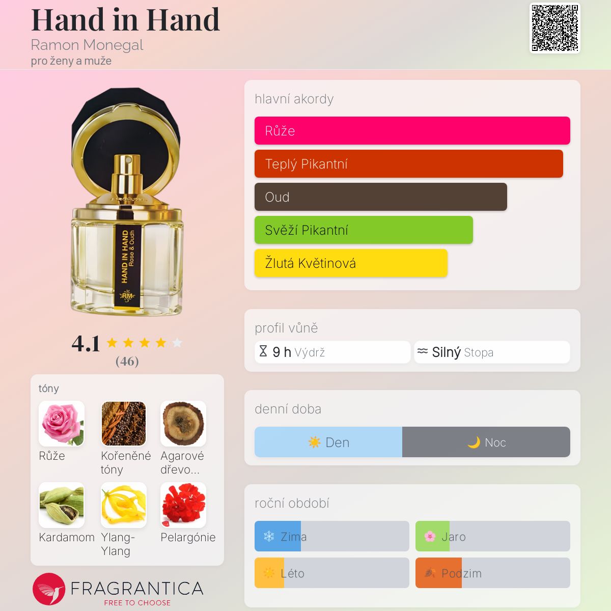 Hand in Hand podle Ramon Monegal je Orientální Floral vůně pro ženy a muže. Hand in Hand byl/a uveden/a v roce 2014. Vrchní tóny jsou Kardamom, Ylang-Ylang a Koriandr; střední tóny jsouRůže, Pelargónie a Galbanum ; základní tóny jsou Agarové dřevo (oud), Kůže a Madagaskarský vetiver.