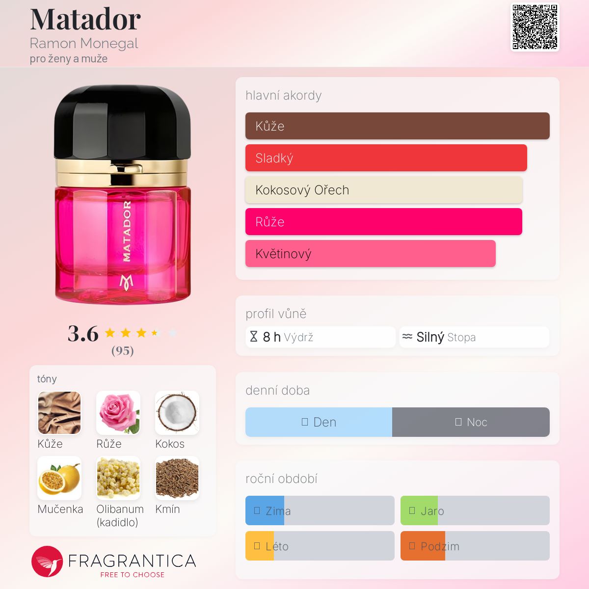 Matador podle Ramon Monegal je Floral Woody Musk vůně pro ženy a muže. Toto je nová vůně. Matador byl/a uveden/a v roce 2025. "Nosem" za touto vůní je Ramon Monegal. Vrchní tóny jsou Kadidlo, Kmín a Hruška; střední tóny jsouRůže, Mučenka, Jasmín a Magnólie ; základní tóny jsou Kůže, Kokos, Santalové dřevo a Pižmo.