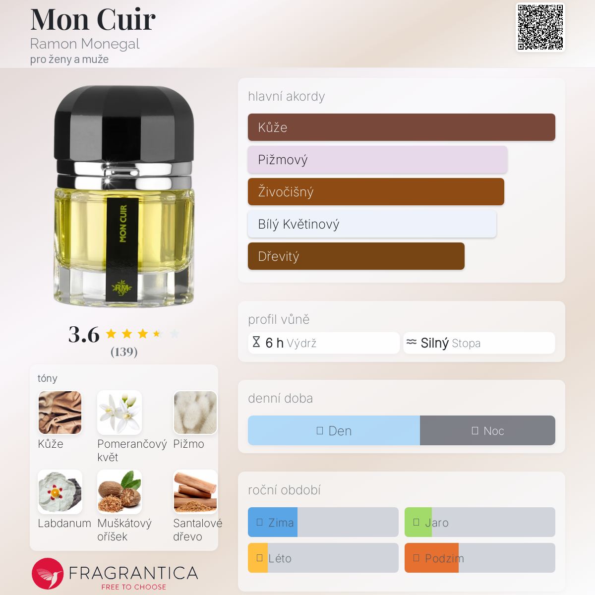 Mon Cuir podle Ramon Monegal je Leather vůně pro ženy a muže. Mon Cuir byl/a uveden/a v roce 2012. "Nosem" za touto vůní je Ramon Monegal.