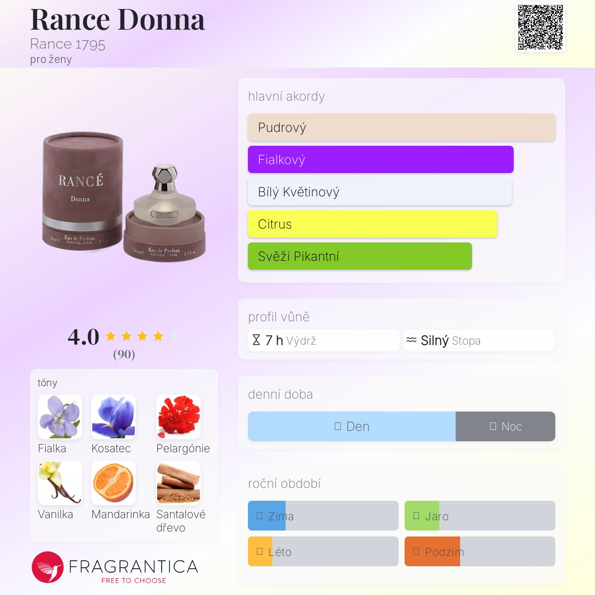 Rance Donna podle Rance 1795 je Floral vůně pro ženy. "Nosem" za touto vůní je Jeanne Sandra Rance. Vrchní tóny jsou Fialka, Mandarinka, Broskev a Bergamot; střední tóny jsouKvět afrického pomeranče, Konvalinka, Růže a Jasmín ; základní tóny jsou Kosatec, Pelargónie, Vanilka a Santalové dřevo.