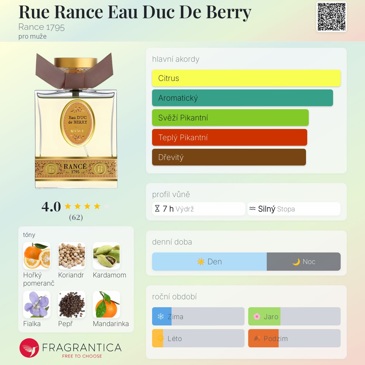 Rue Rance Eau Duc De Berry podle Rance 1795 je Woody Aromatic vůně pro muže. Rue Rance Eau Duc De Berry byl/a uveden/a v roce 2009. "Nosem" za touto vůní je Jeanne Sandra Rance. Vrchní tóny jsou Hořký pomeranč, Koriandr a Mandarinka; střední tóny jsouKardamom, Fialka, Pepř a Růže ; základní tóny jsou Virginský cedr, Muškátový oříšek, Vetiver a Dubový mech.