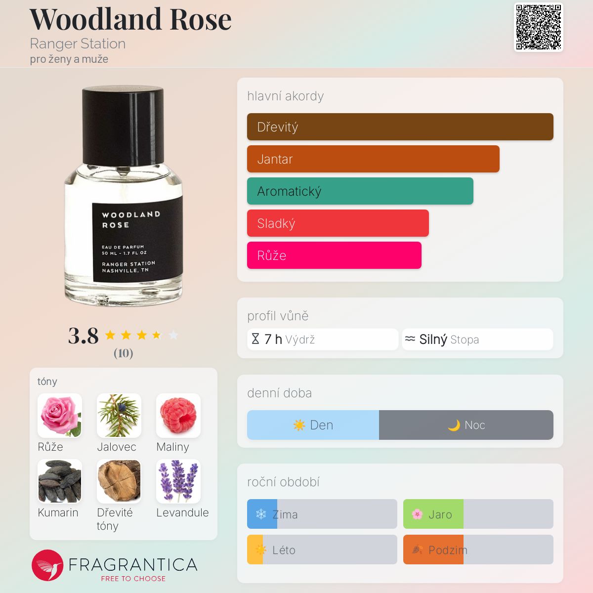 Woodland Rose podle Ranger Station je Floral vůně pro ženy a muže. Woodland Rose byl/a uveden/a v roce 2020. "Nosem" za touto vůní je Steve Soderholm. Vrchní tóny jsou Růže, Jalovec a Maliny; střední tóny jsouKumarin, Dřevité tóny, Levandule, Labdanum a Cedr ; základní tóny jsou Palo Santo, Jantar (ambra) a Ambroxan.