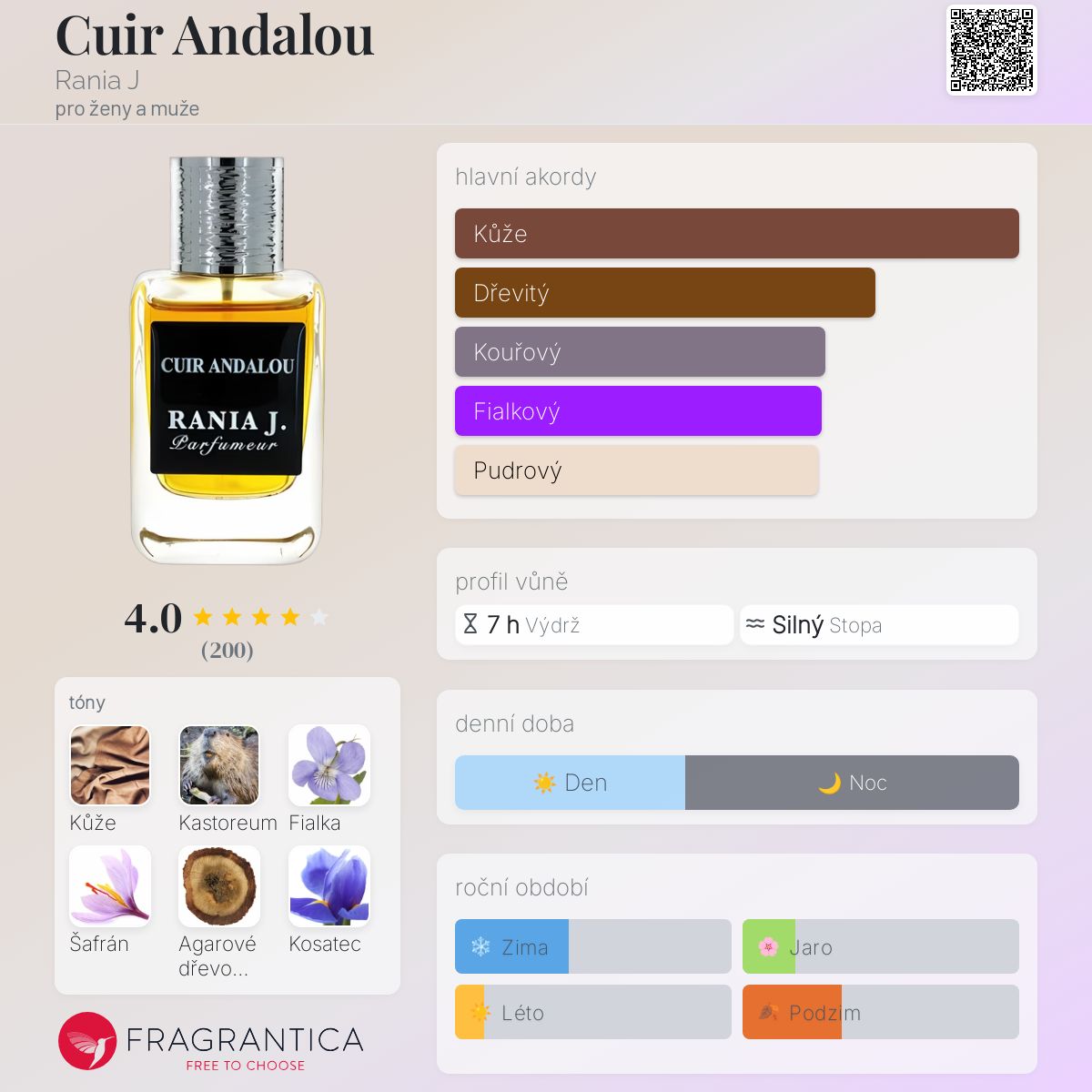 Cuir Andalou podle Rania J je Leather vůně pro ženy a muže. Cuir Andalou byl/a uveden/a v roce 2016. "Nosem" za touto vůní je Rania Jouaneh.