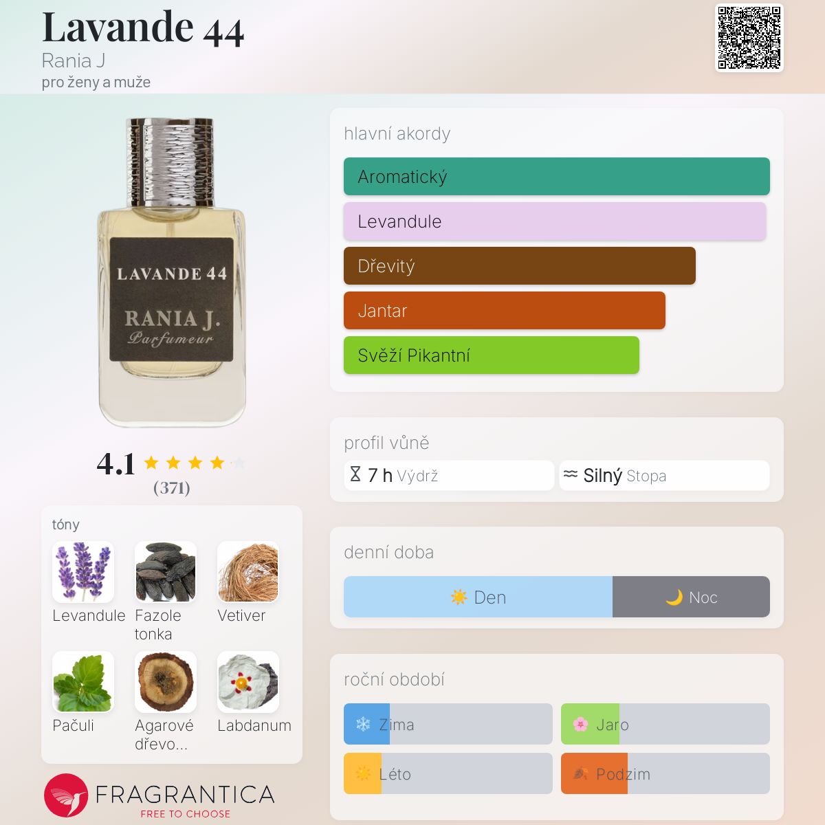 Lavande 44 podle Rania J je Aromatic Spicy vůně pro ženy a muže. Lavande 44 byl/a uveden/a v roce 2012. "Nosem" za touto vůní je Rania Jouaneh. Vrchní tóny jsou Petitgrain a Bergamot; střední tón jeLevandule ; základní tóny jsou Fazole tonka, Vetiver, Pačuli, Agarové dřevo (oud), Labdanum a Pižmo.