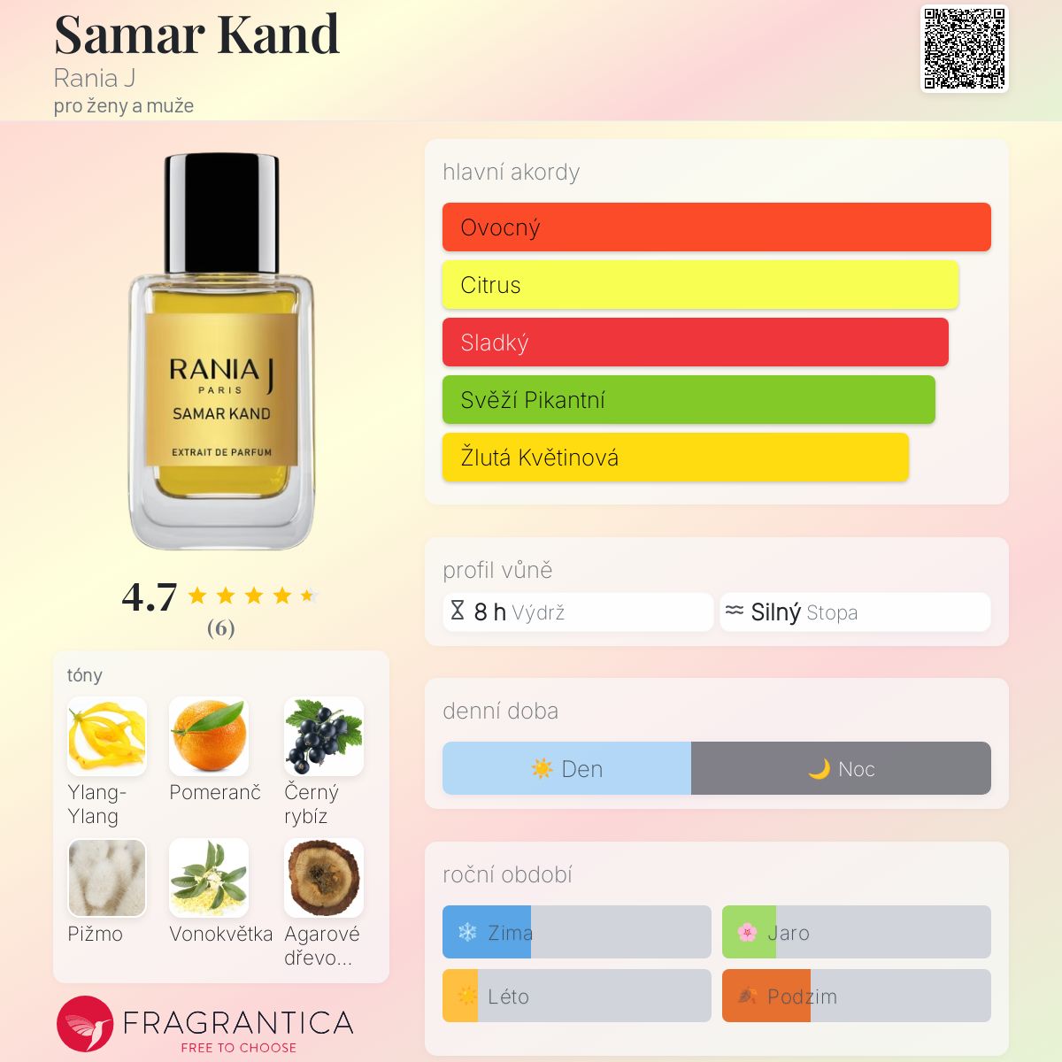 Samar Kand podle Rania J je Orientální Vanilla vůně pro ženy a muže. Toto je nová vůně. Samar Kand byl/a uveden/a v roce 2025. "Nosem" za touto vůní je Rania Jouaneh. Vrchní tóny jsou Sladký pomeranč a Bergamot; střední tóny jsouČerný rybíz, Ylang-Ylang, Vonokvětka a Pelargónie ; základní tóny jsou Pižmo, Agarové dřevo (oud), Fazole tonka, Karamel, Jantar (ambra), Santalové dřevo a Pačuli.