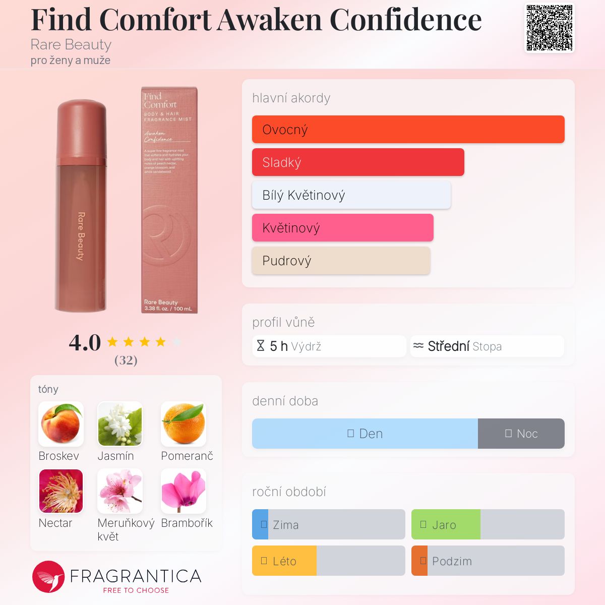 Find Comfort Awaken Confidence podle Rare Beauty je vůně pro ženy a muže. Vrchní tóny jsou Broskev, Pomeranč, Nectar, Citrón a Černý pepř; střední tóny jsouJasmín, Meruňkový květ, Brambořík a Levandule ; základní tóny jsou Pižmo, Kůže, Bílé santalové dřevo a Jantar (ambra).
