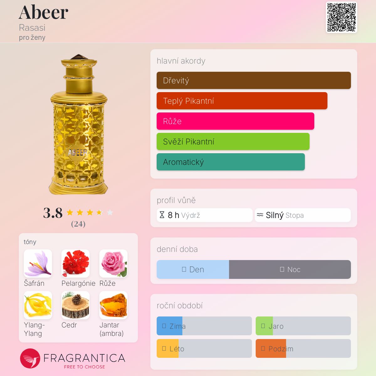 Abeer podle Rasasi je Floral Woody Musk vůně pro ženy. Vrchní tóny jsou Šafrán, Ylang-Ylang, Levandule a Bergamot; střední tóny jsouPelargónie, Růže, Virginský cedr, Jantar (ambra) a Jasmín ; základní tóny jsou Santalové dřevo, Pačuli a Pižmo.
