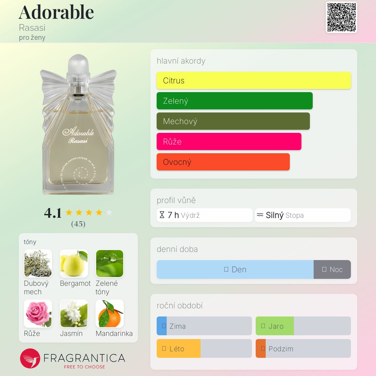 Adorable podle Rasasi je Floral Fruity vůně pro ženy. Vrchní tóny jsou Bergamot, Zelené listí a Mandarinka; střední tóny jsouRůže, Jasmín, Broskev a Liči ; základní tóny jsou Dubový mech, Pižmo a Cedr.