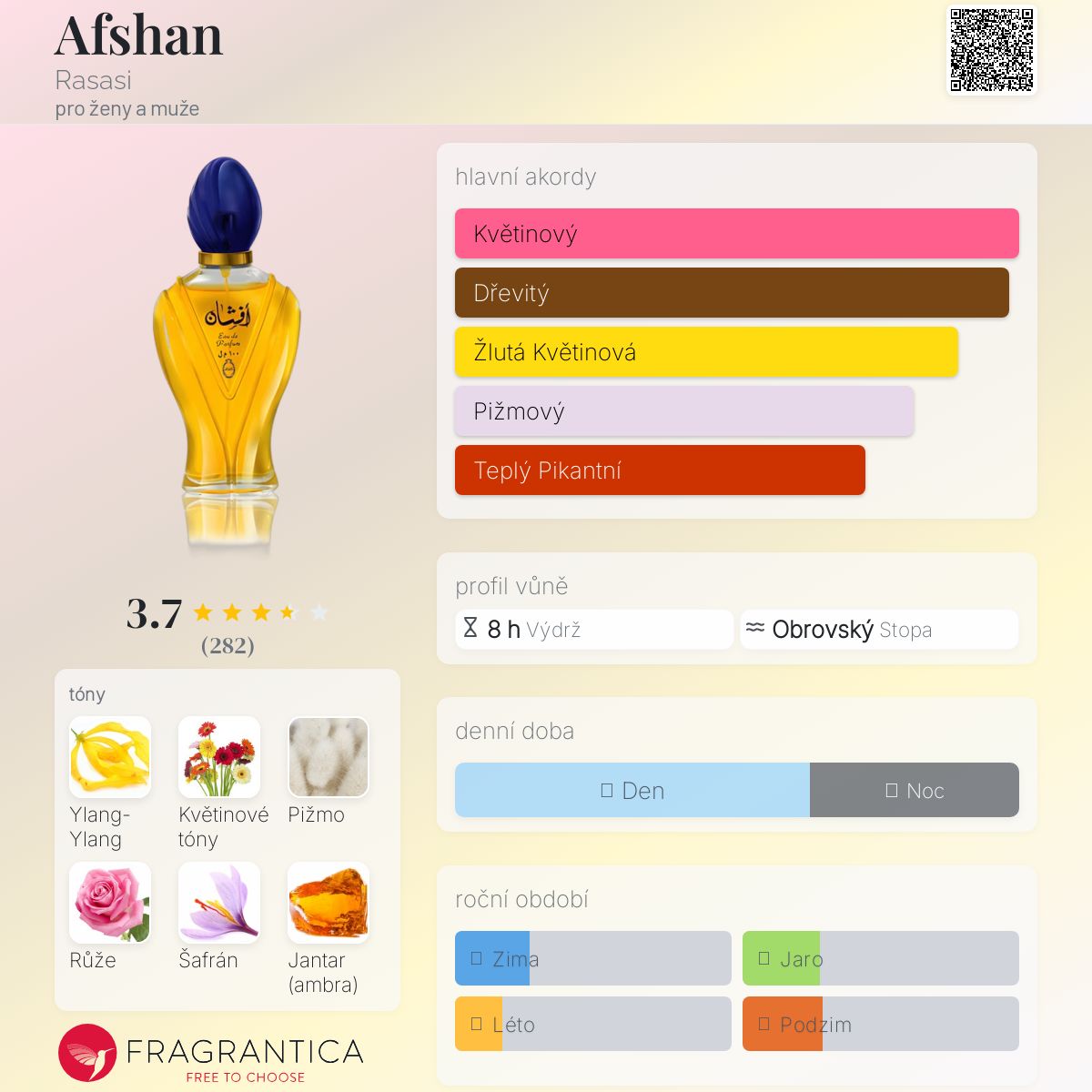 Afshan podle Rasasi je Orientální vůně pro ženy a muže. Vrchní tóny jsou Květinové tóny, Šafrán a Zelené tóny; střední tóny jsouYlang-Ylang, Růže a Kořeněné tóny ; základní tóny jsou Pižmo, Jantar (ambra), Dřevité tóny a Cedr.