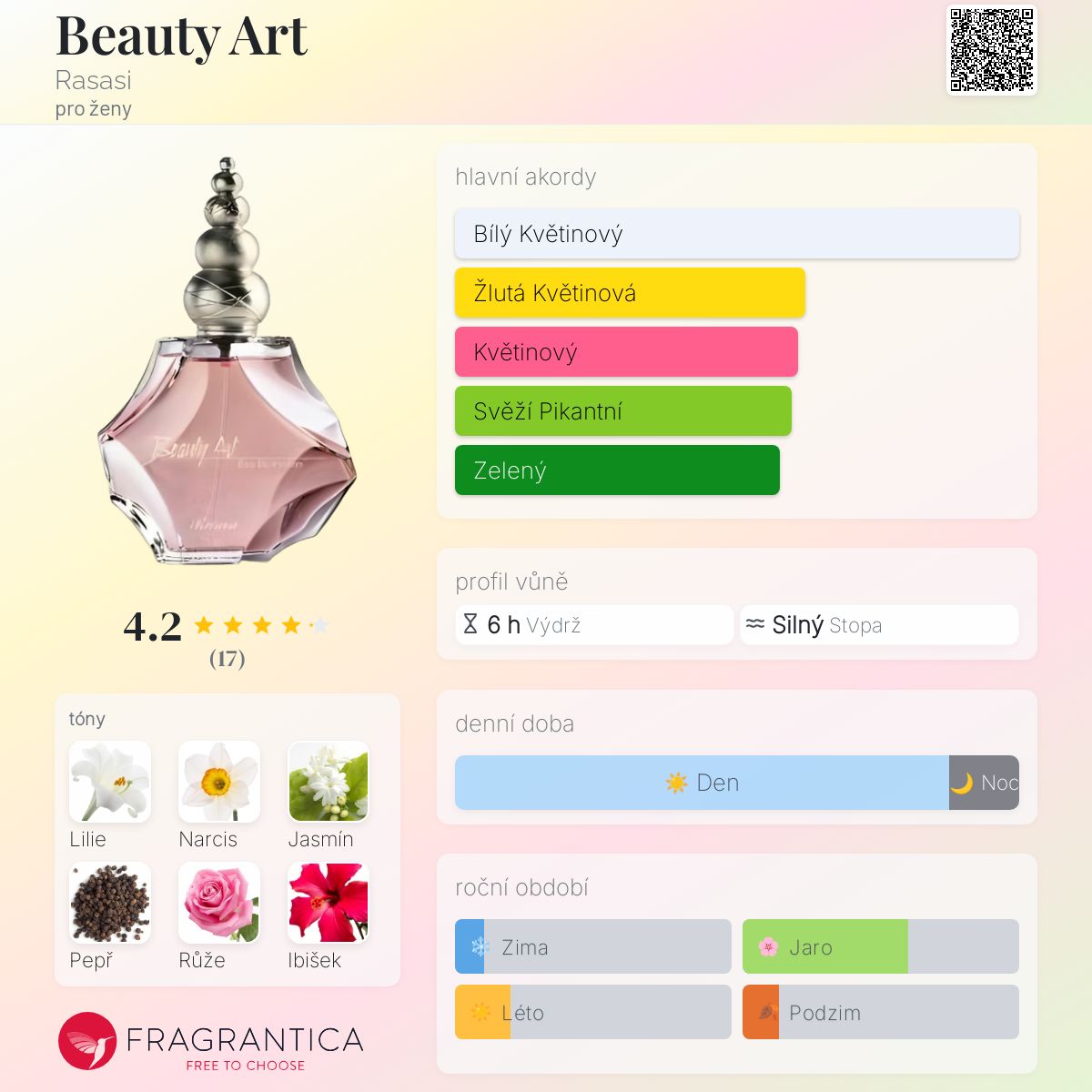Beauty Art podle Rasasi je Floral vůně pro ženy. Vrchní tóny jsou Lilie, Narcis, Jasmín a Ibišek; střední tóny jsouPepř a Turecká růže ; základní tóny jsou Pižmo a Cedr.