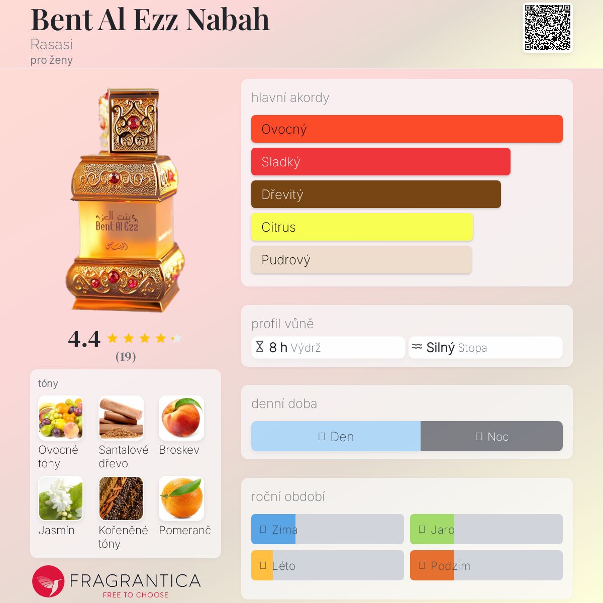 Bent Al Ezz Nabah podle Rasasi je Floral Fruity vůně pro ženy. Bent Al Ezz Nabah byl/a uveden/a v roce 2014. Vrchní tóny jsou Ovocné tóny, Pomeranč, Vanilka, Bergamot a Růže; střední tóny jsouBroskev, Jasmín, Velká jahoda a Mango ; základní tóny jsou Santalové dřevo, Kořeněné tóny, Jantar (ambra), Dřevité tóny a Pižmo.