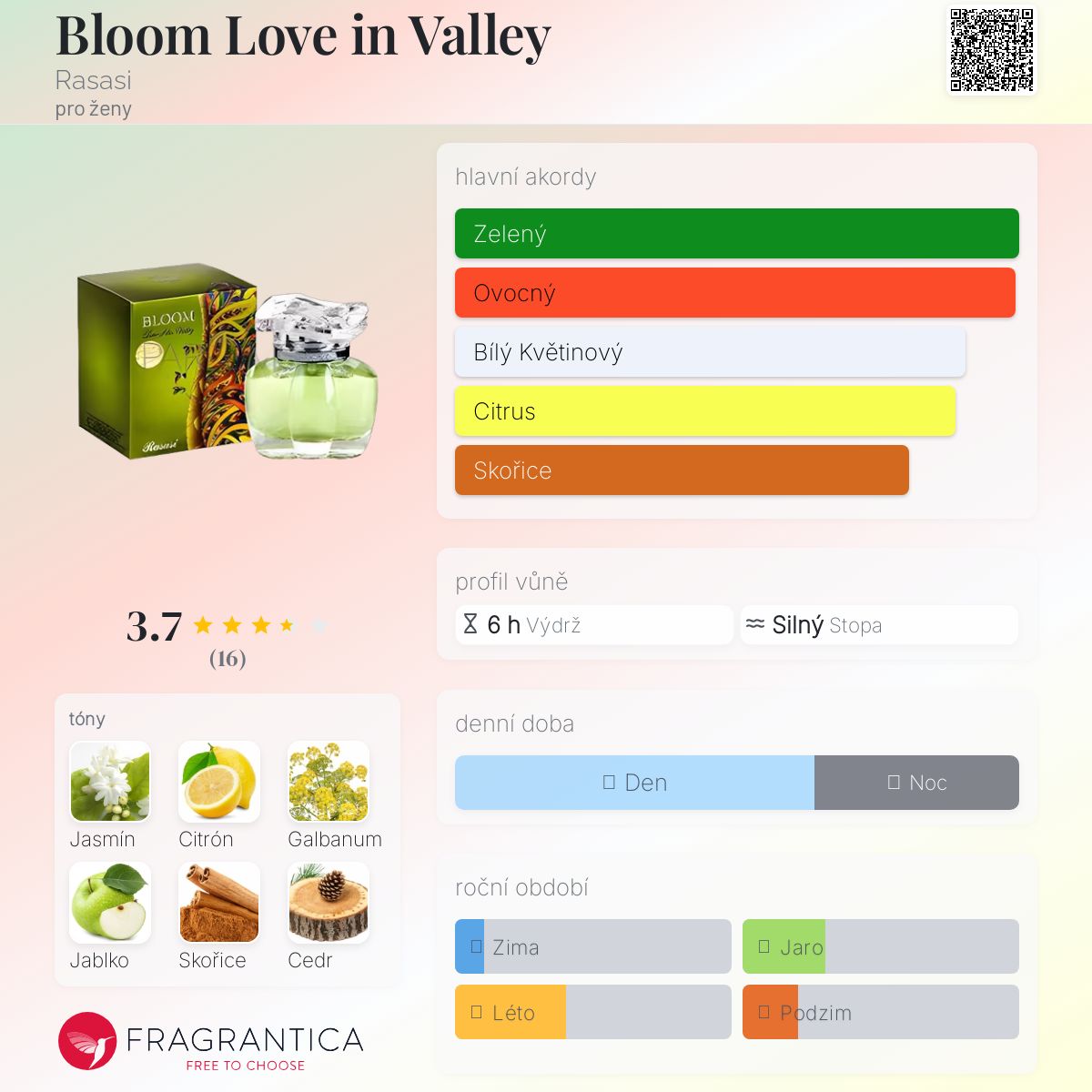 Bloom Love in Valley podle Rasasi je Floral Fruity vůně pro ženy. Bloom Love in Valley byl/a uveden/a v roce 2012. Vrchní tóny jsou Citrón, Galbanum a Jablko; střední tóny jsouJasmín, Skořice, Růže a Ovocné tóny ; základní tóny jsou Cedr, Jantar (ambra) a Pižmo.