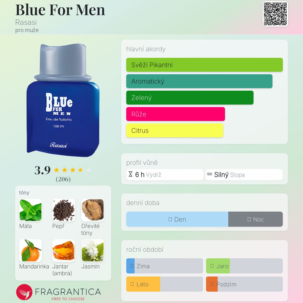 Blue For Men podle Rasasi je Aromatic Spicy vůně pro muže. Vrchní tóny jsou Máta a Mandarinka; střední tóny jsouPepř, Jasmín, Růže, Koriandr a Pelargónie ; základní tóny jsou Dřevité tóny a Jantar (ambra).